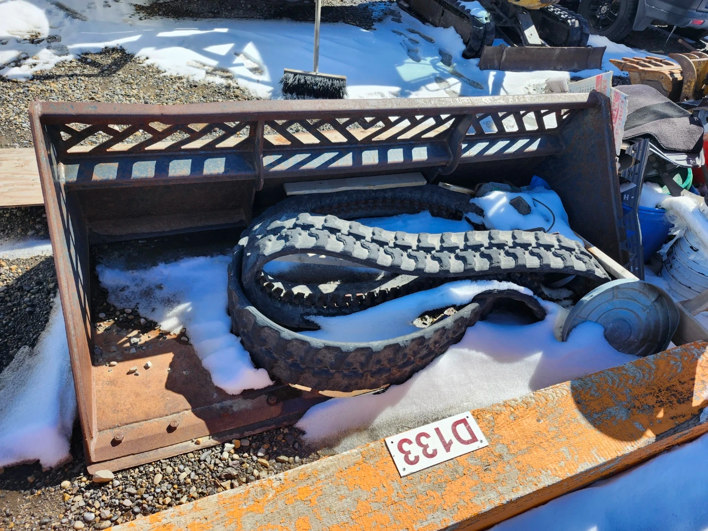 Selling a used skid steer bucket attachment. It also comes with a track. Good for moving materials and other heavy-duty tasks.