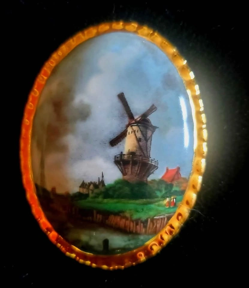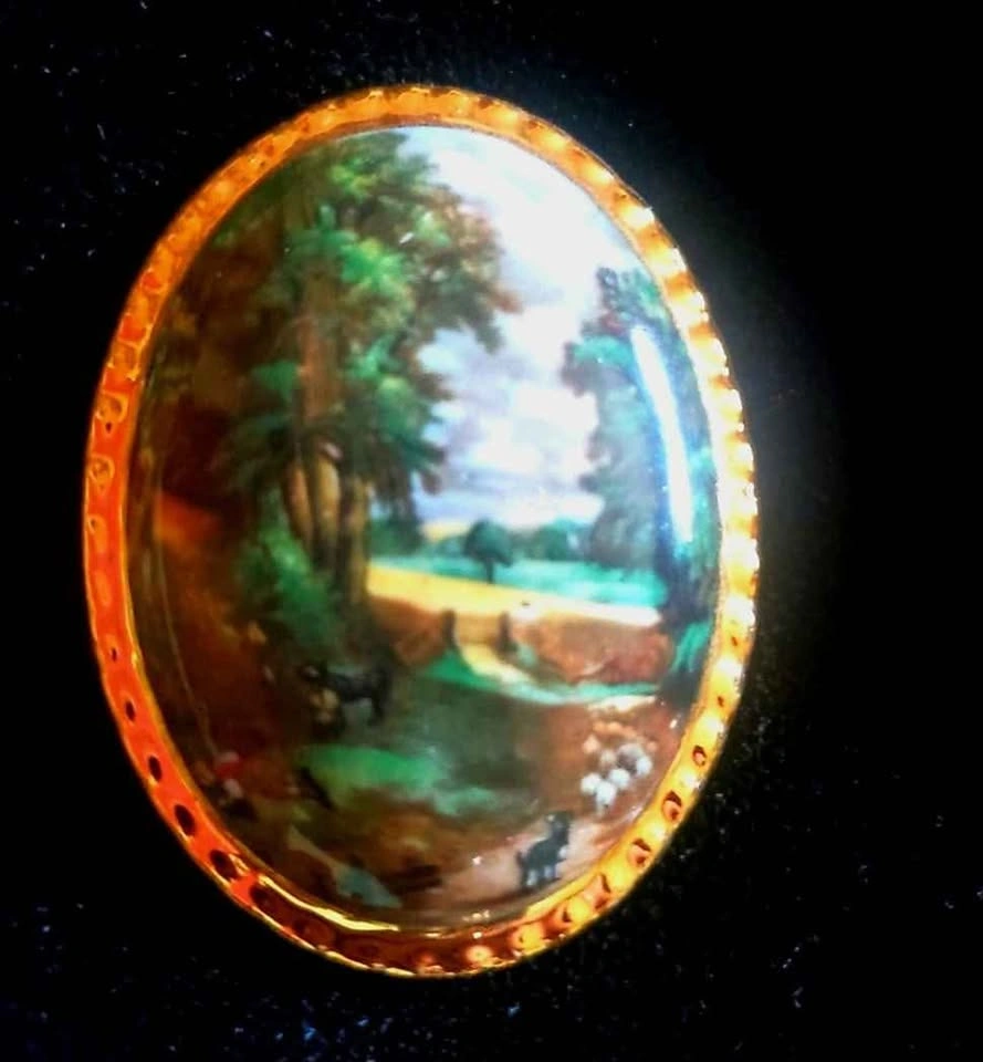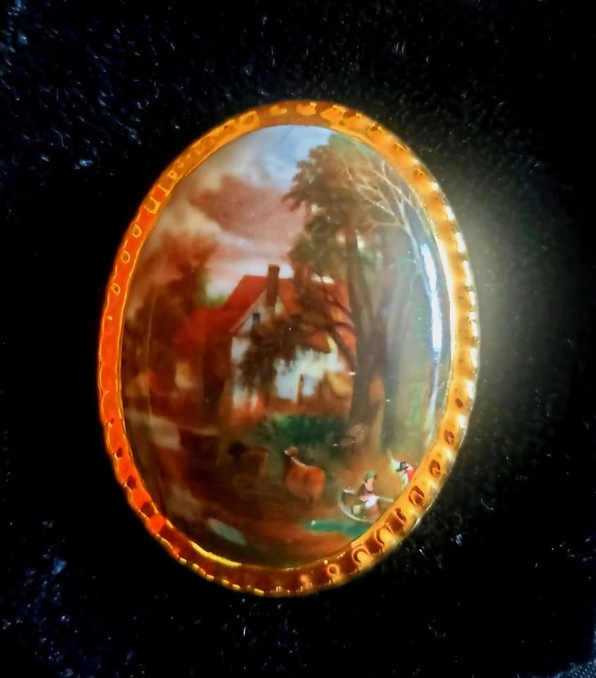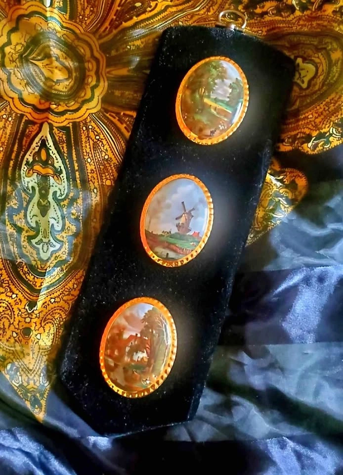 Beautiful vintage cottagecore/ grannycore wall decor, made in England in 1971 by Countess Fine Bone China. A wood base, covered in black velvet, with three bone china scenes of countryside landscape paintings, each in a ornate gold frame. Piece is in very good vintage condition, the back shows some wear but the front is in excellent shape. Wall plaque measures about 3.5" wide by 10" long (without hanger).
