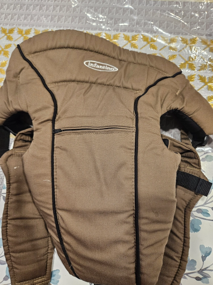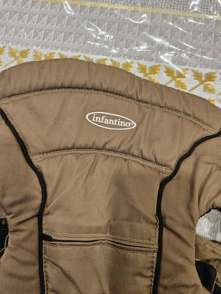 Infantino baby carrier. Brown color. Good used condition. Features adjustable straps and a small pocket.