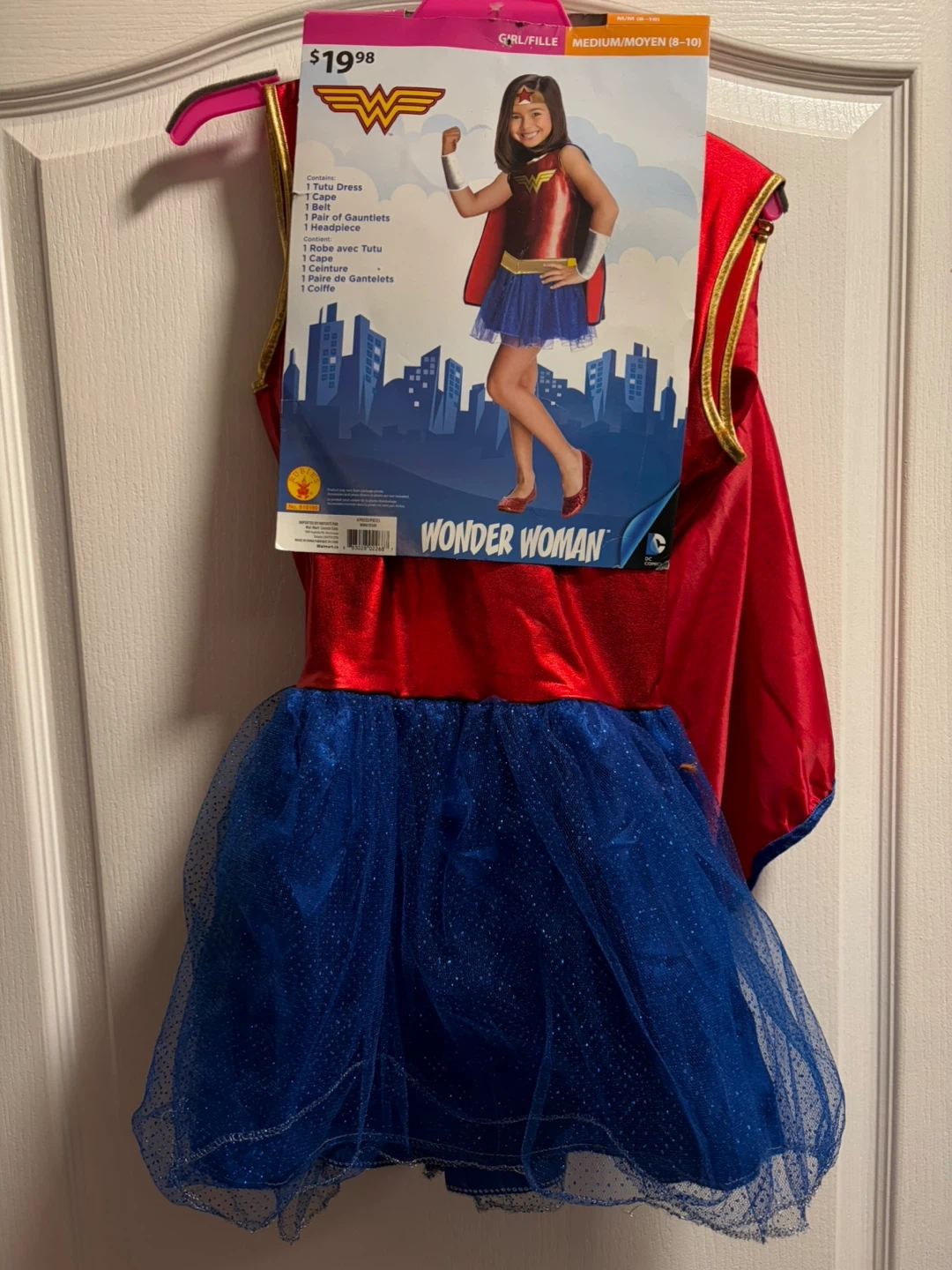 This Wonder Woman costume dress includes a tutu dress and cape. It's designed for girls aged 8-10. Perfect for dress-up or Halloween! Size medium