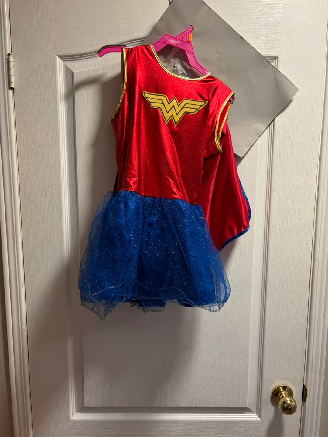 This Wonder Woman costume dress includes a tutu dress and cape. It's designed for girls aged 8-10. Perfect for dress-up or Halloween! Size medium