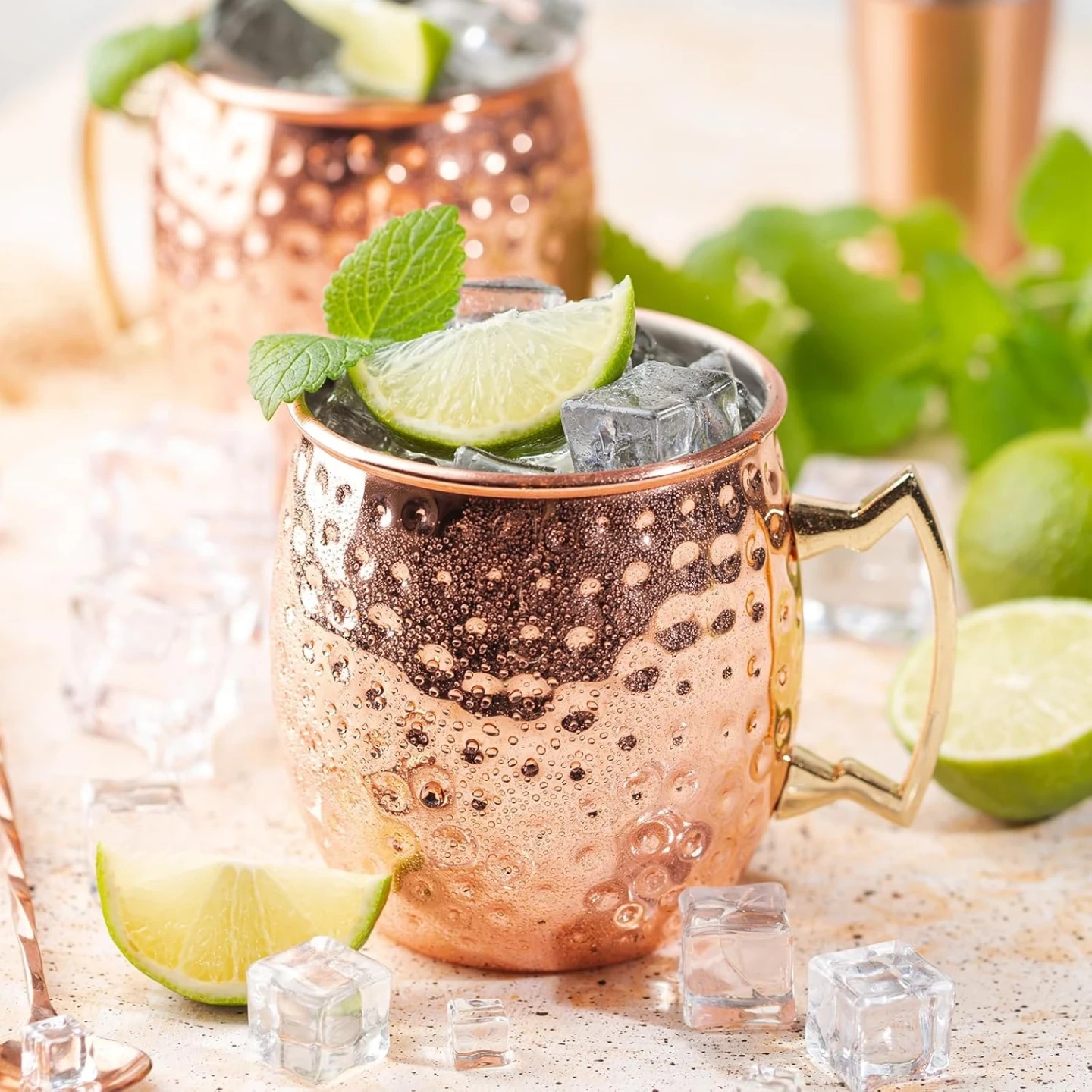 Add a touch of elegance to your barware with this set of four Artisan Products copper mugs! These mugs feature a polished hammered finish and solid brass handles. Each mug holds 16 fl oz, perfect for your favourite drinks. The mugs have a solid food-safe nickel inner wall and a copper outer wall with a polished hammered finish. They are brand new in the box!