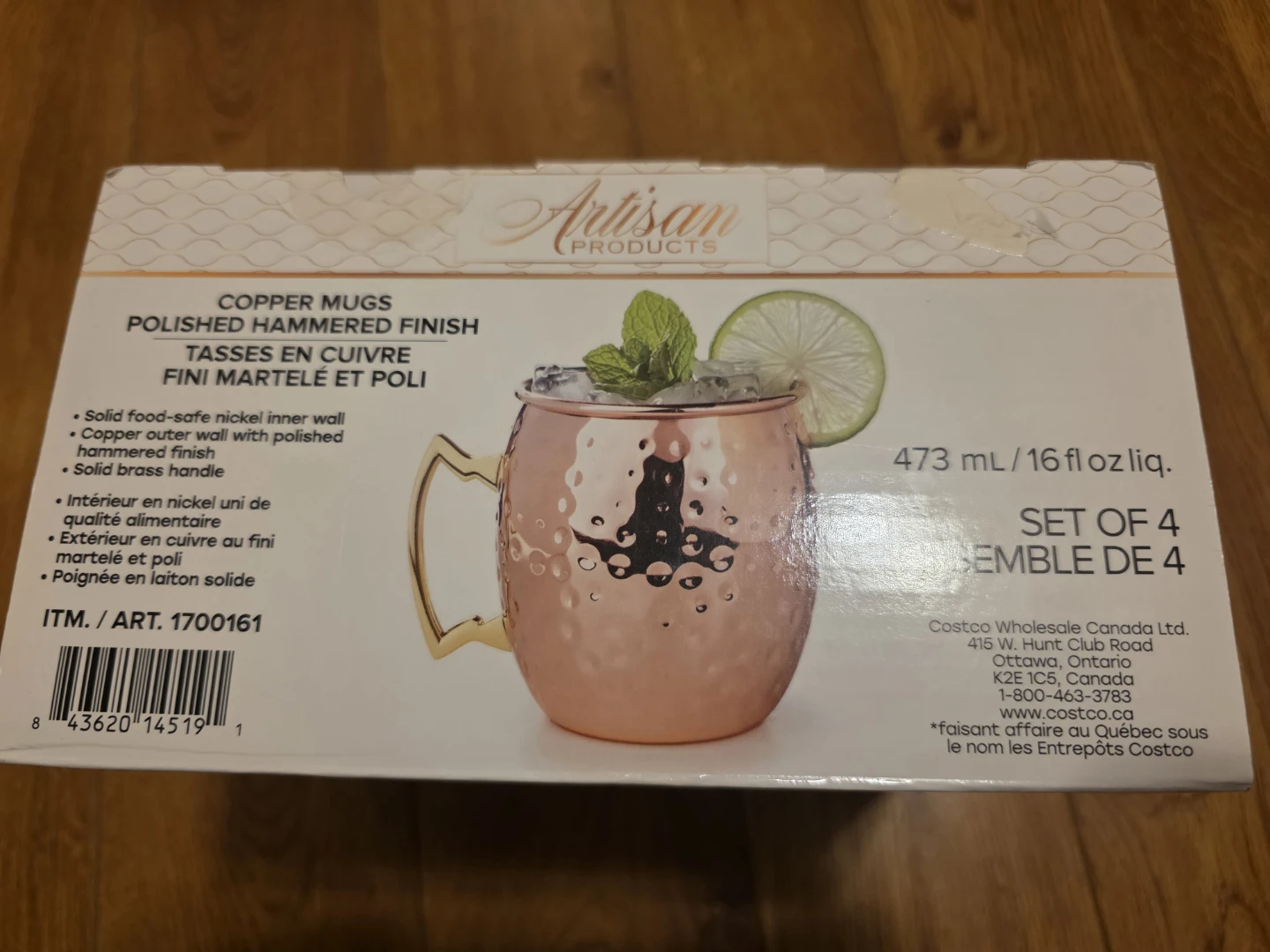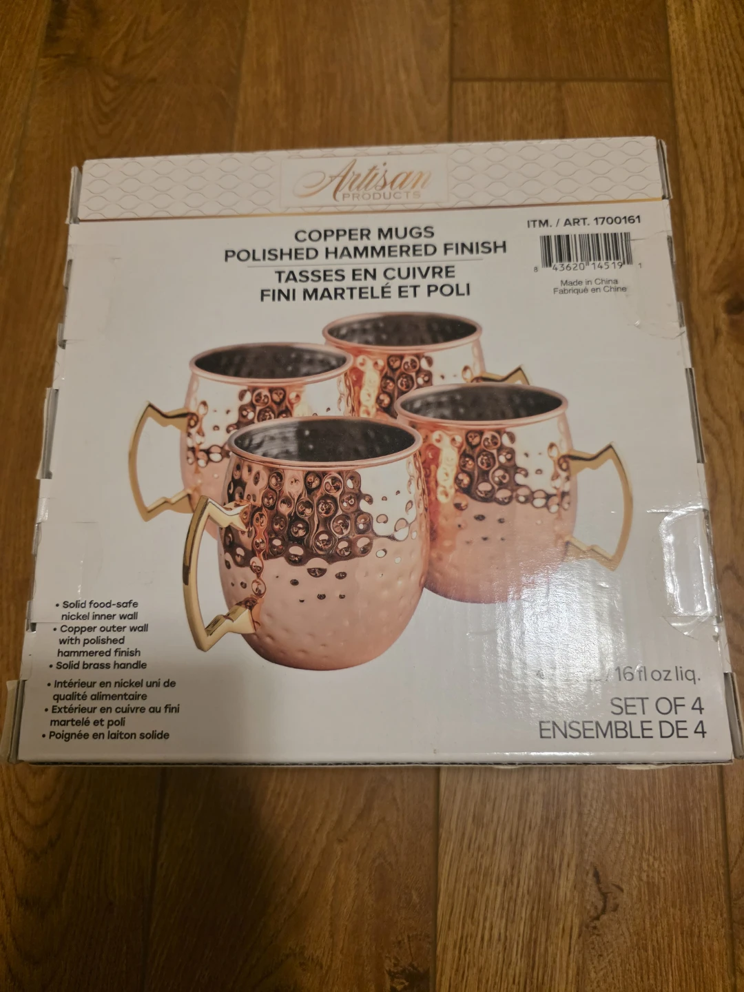 Add a touch of elegance to your barware with this set of four Artisan Products copper mugs! These mugs feature a polished hammered finish and solid brass handles. Each mug holds 16 fl oz, perfect for your favourite drinks. The mugs have a solid food-safe nickel inner wall and a copper outer wall with a polished hammered finish. They are brand new in the box!