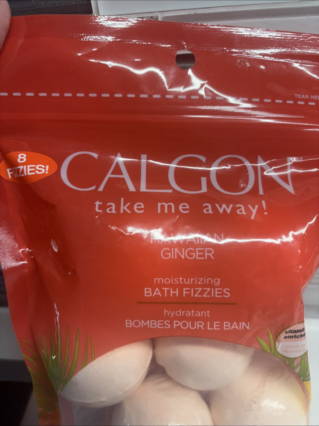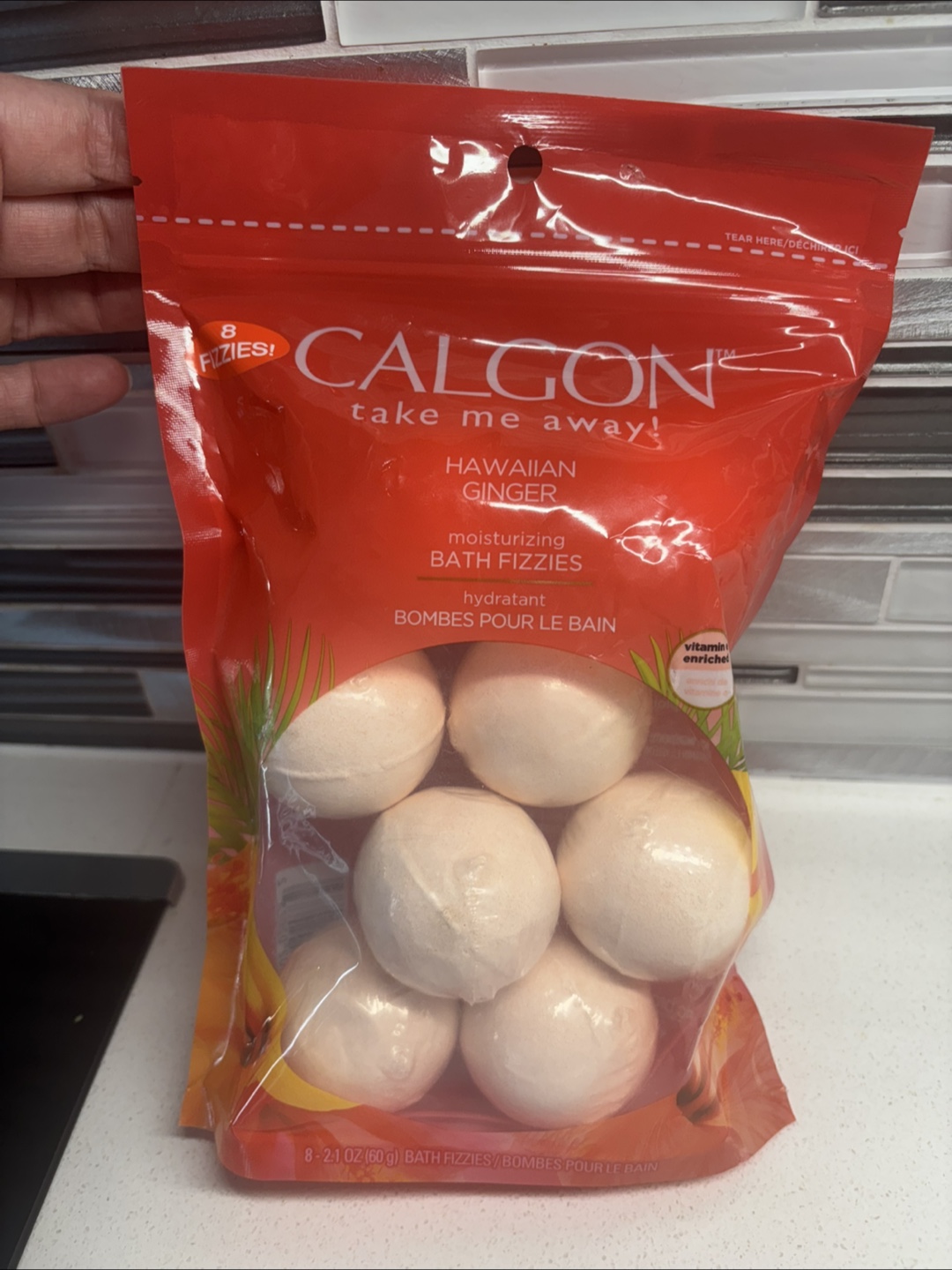 Calgon Hawaiian Ginger moisturizing bath fizzes. Contains 8 fizzy balls. Each bath fizzy is 2.1 oz (60g).
