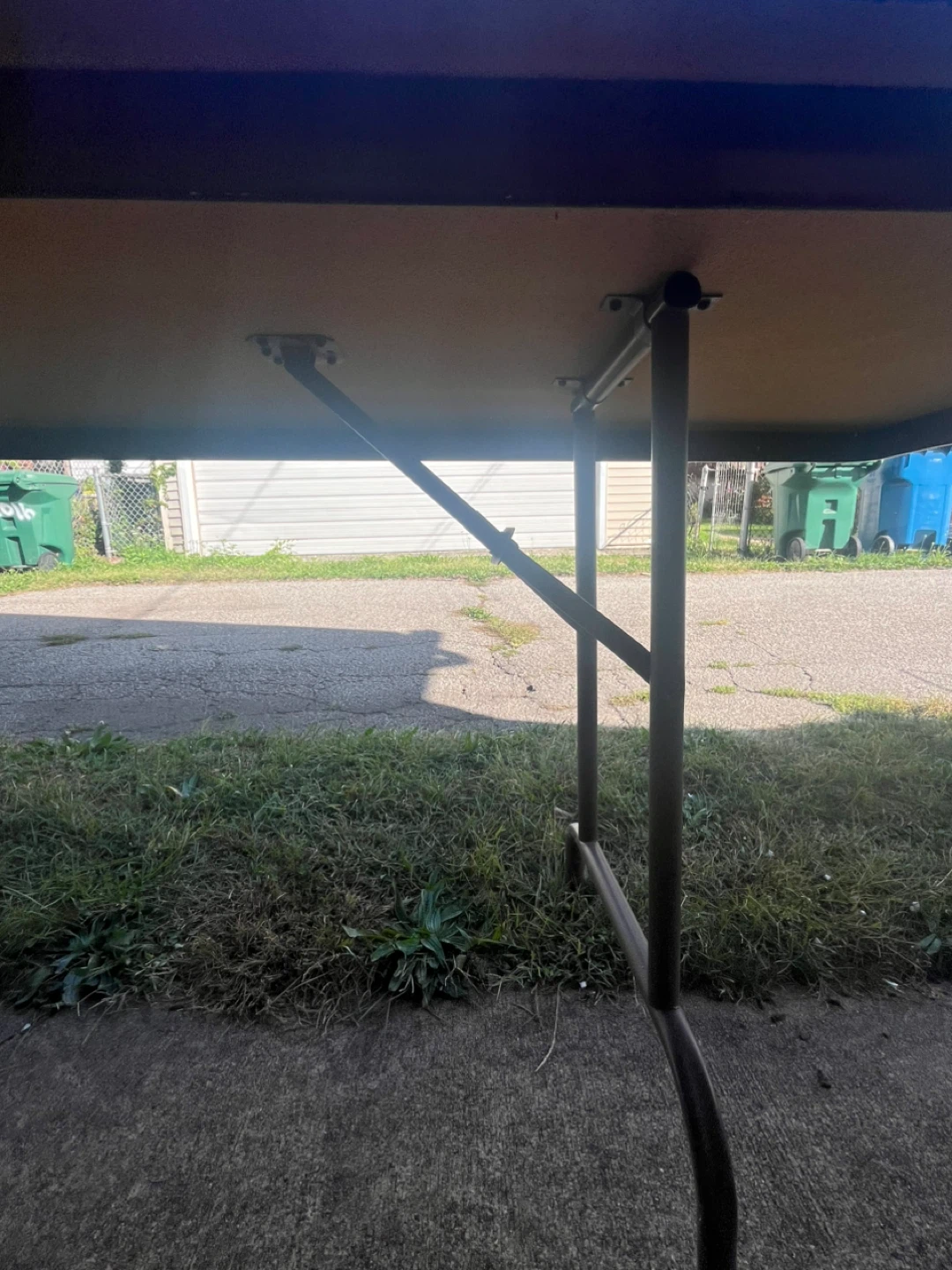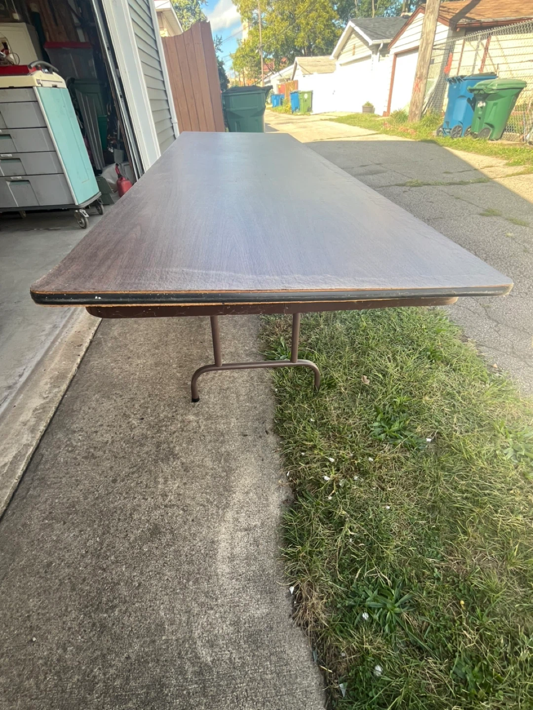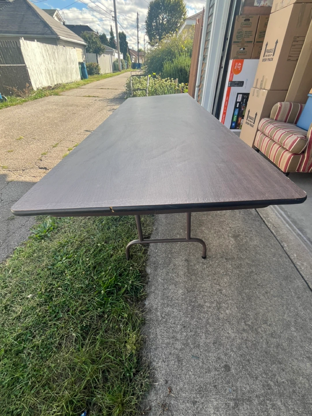 Selling a folding table that's perfect for events or extra space! It's brown and has folding legs for easy storage. It has some wear and tear, but is still sturdy and functional.