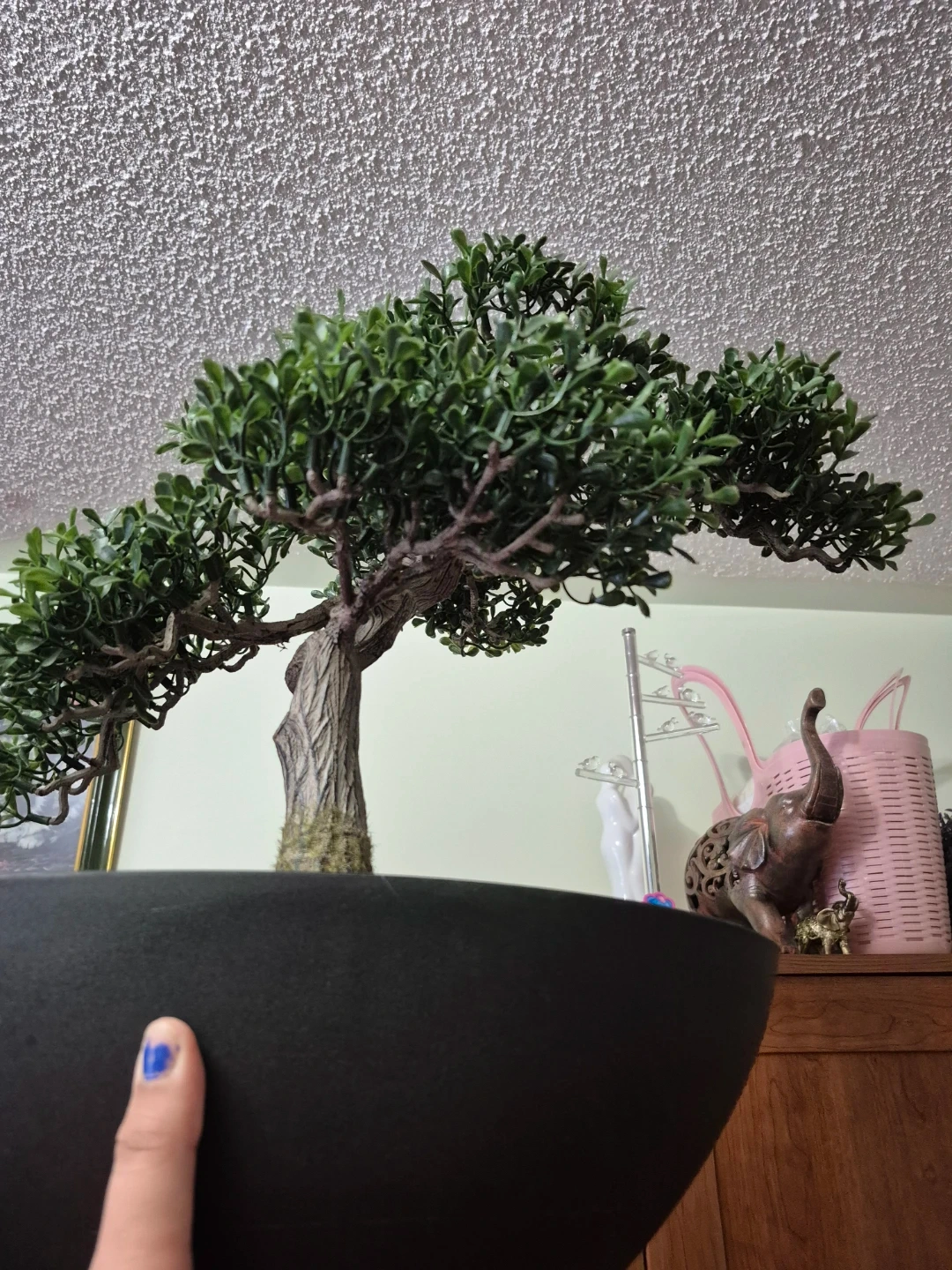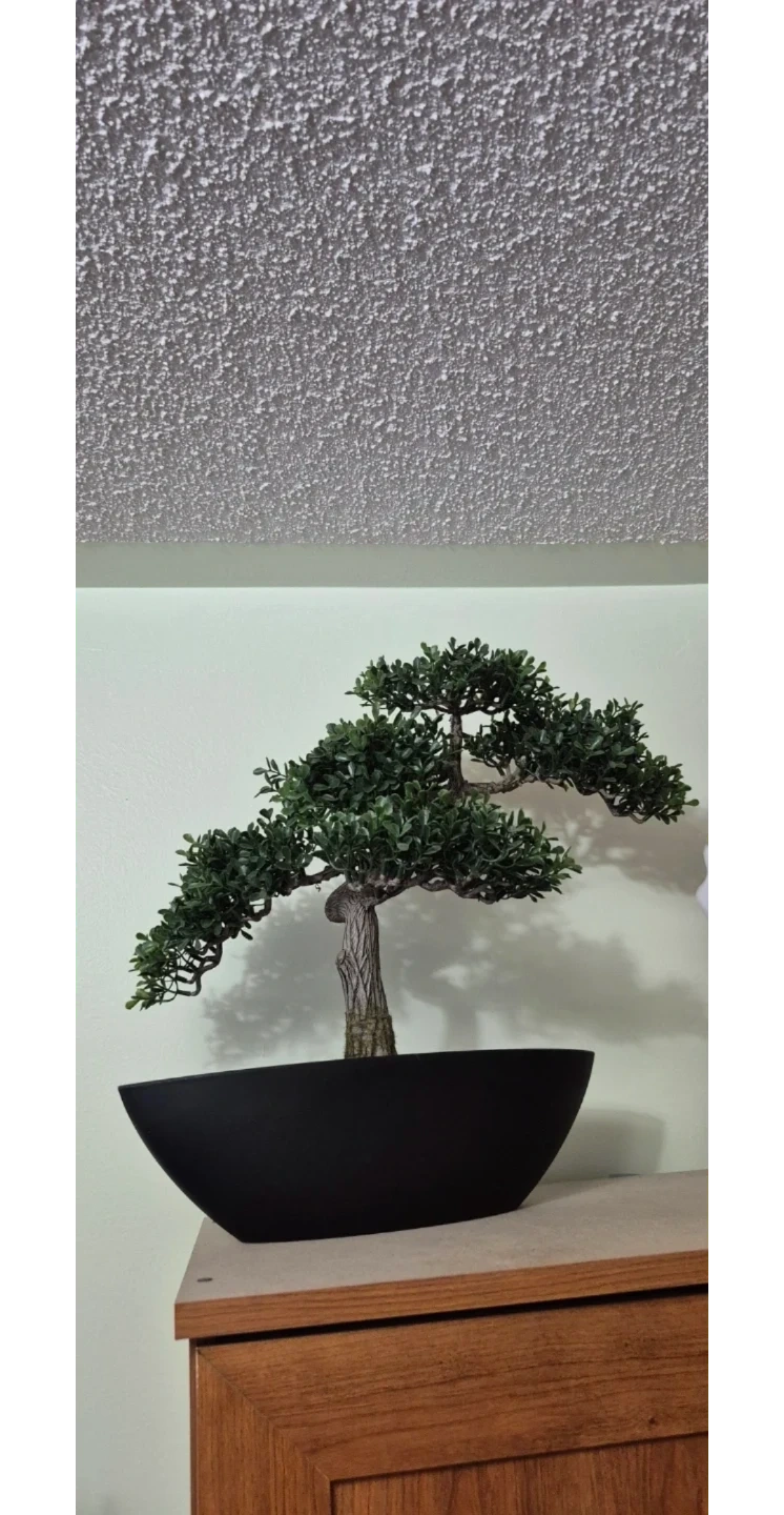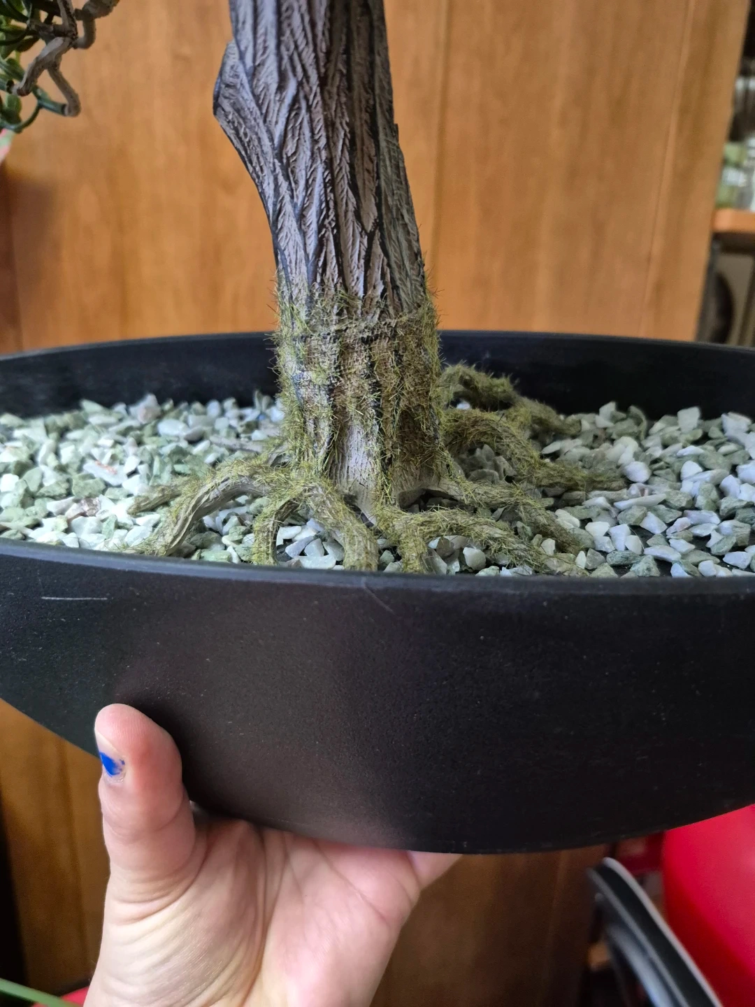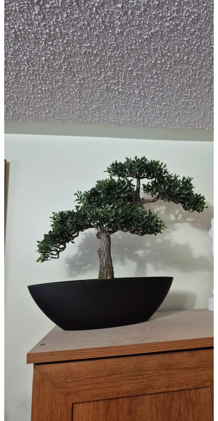 This faux bonsai tree comes in a stylish black pot with small white stones. It's a maintenance-free way to add a touch of greenery to your space. The pot has a textured finish.
