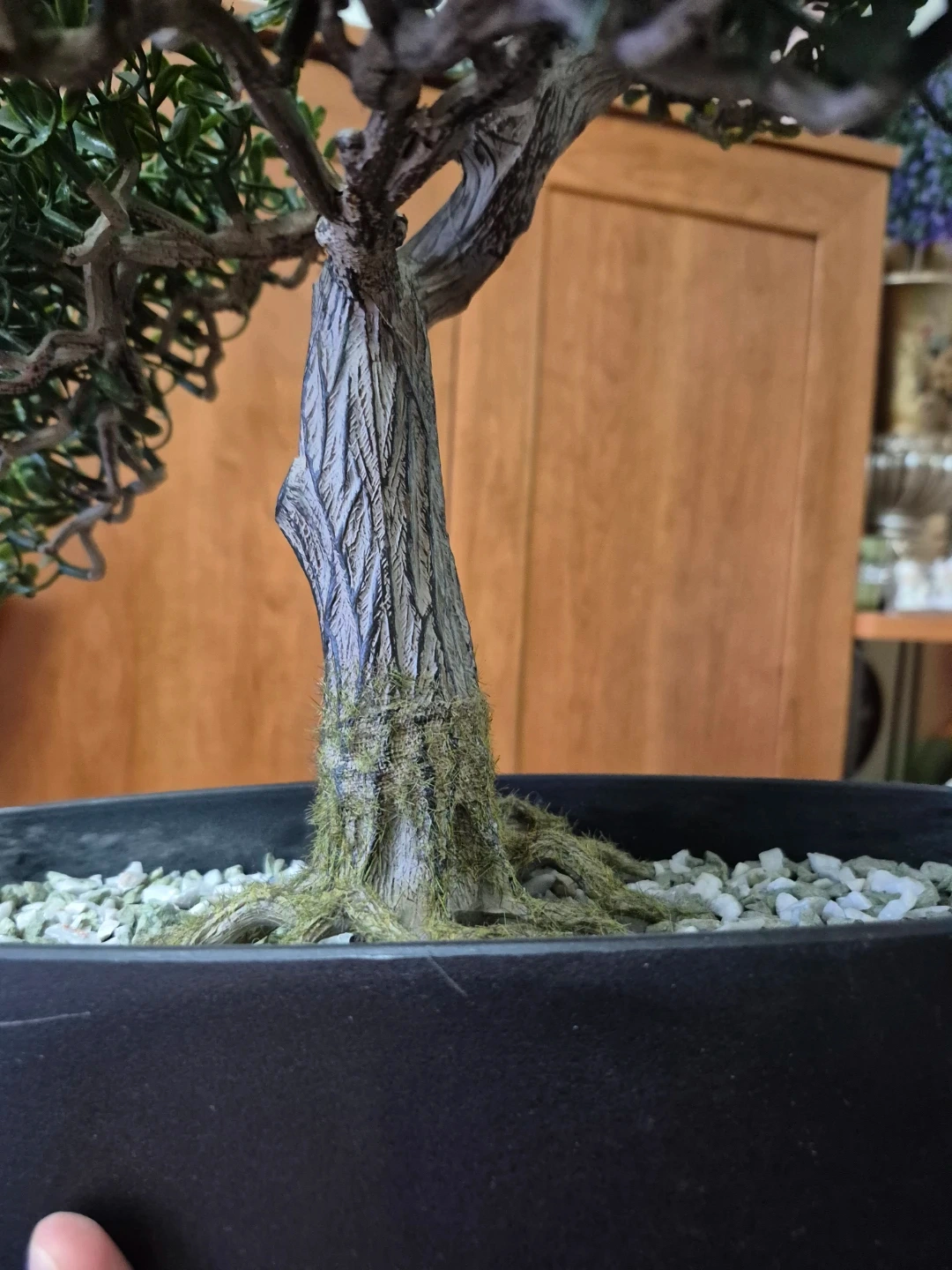 This faux bonsai tree comes in a stylish black pot with small white stones. It's a maintenance-free way to add a touch of greenery to your space. The pot has a textured finish.