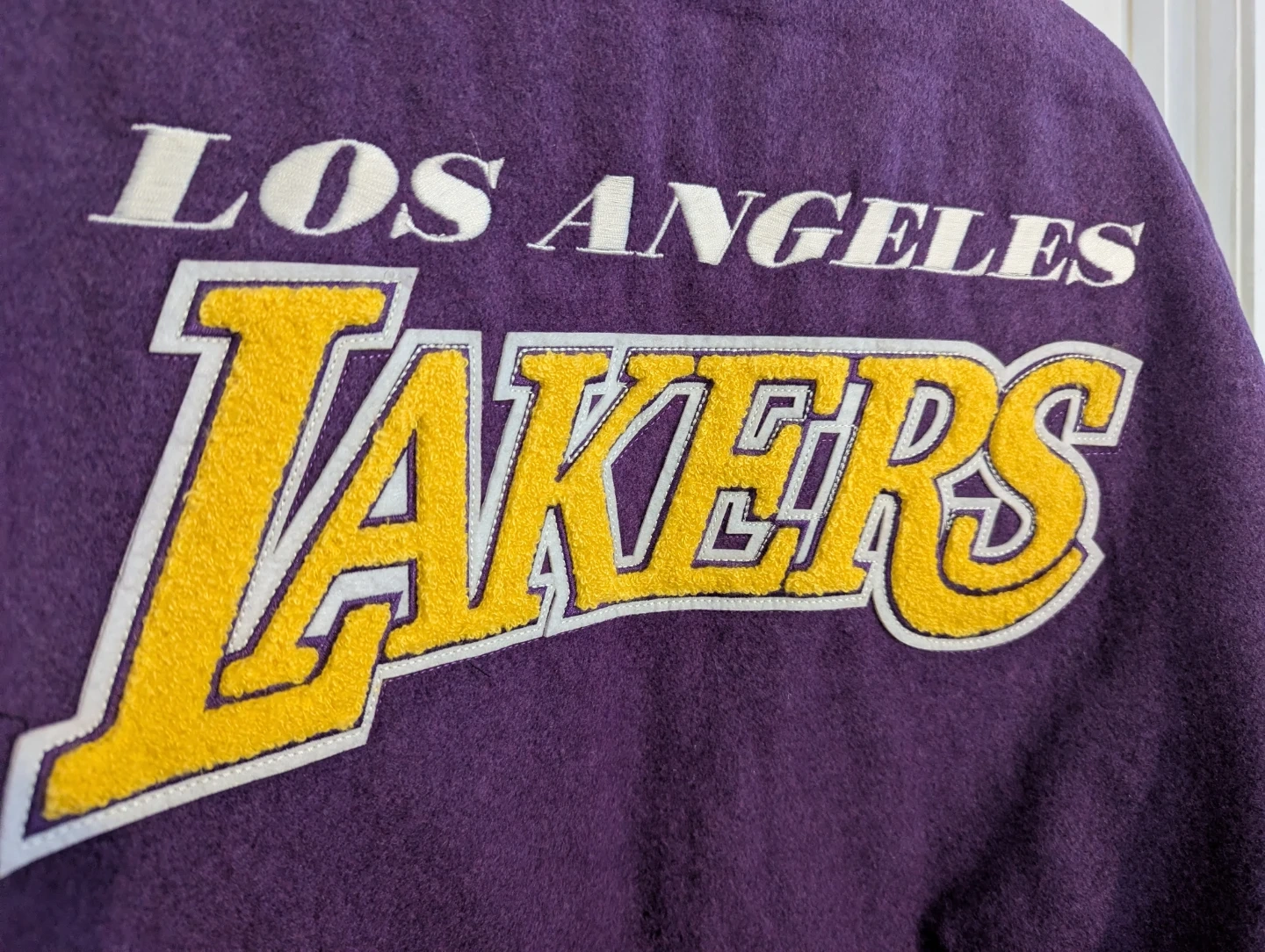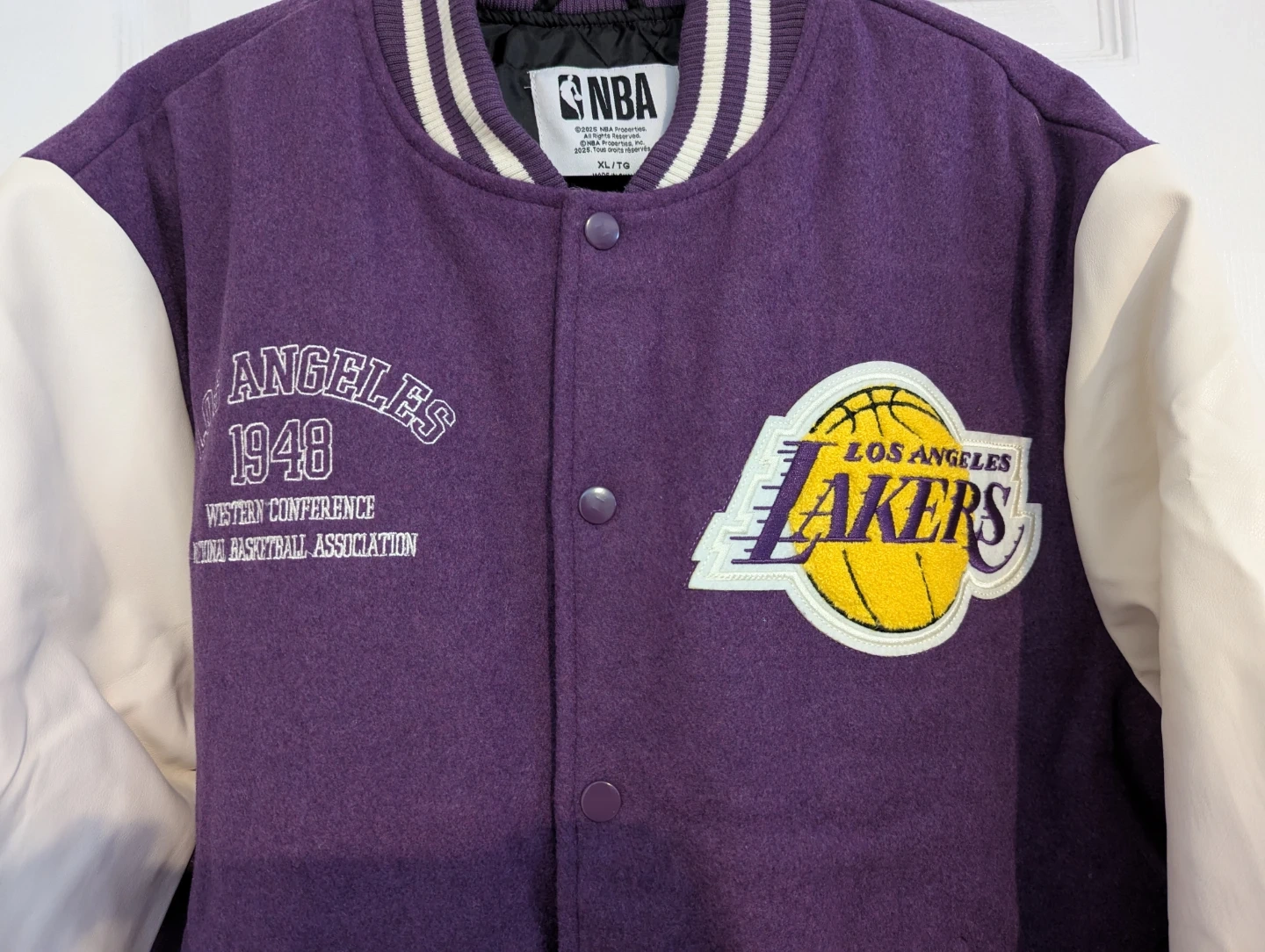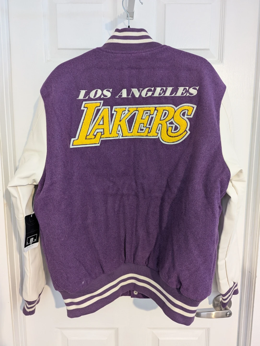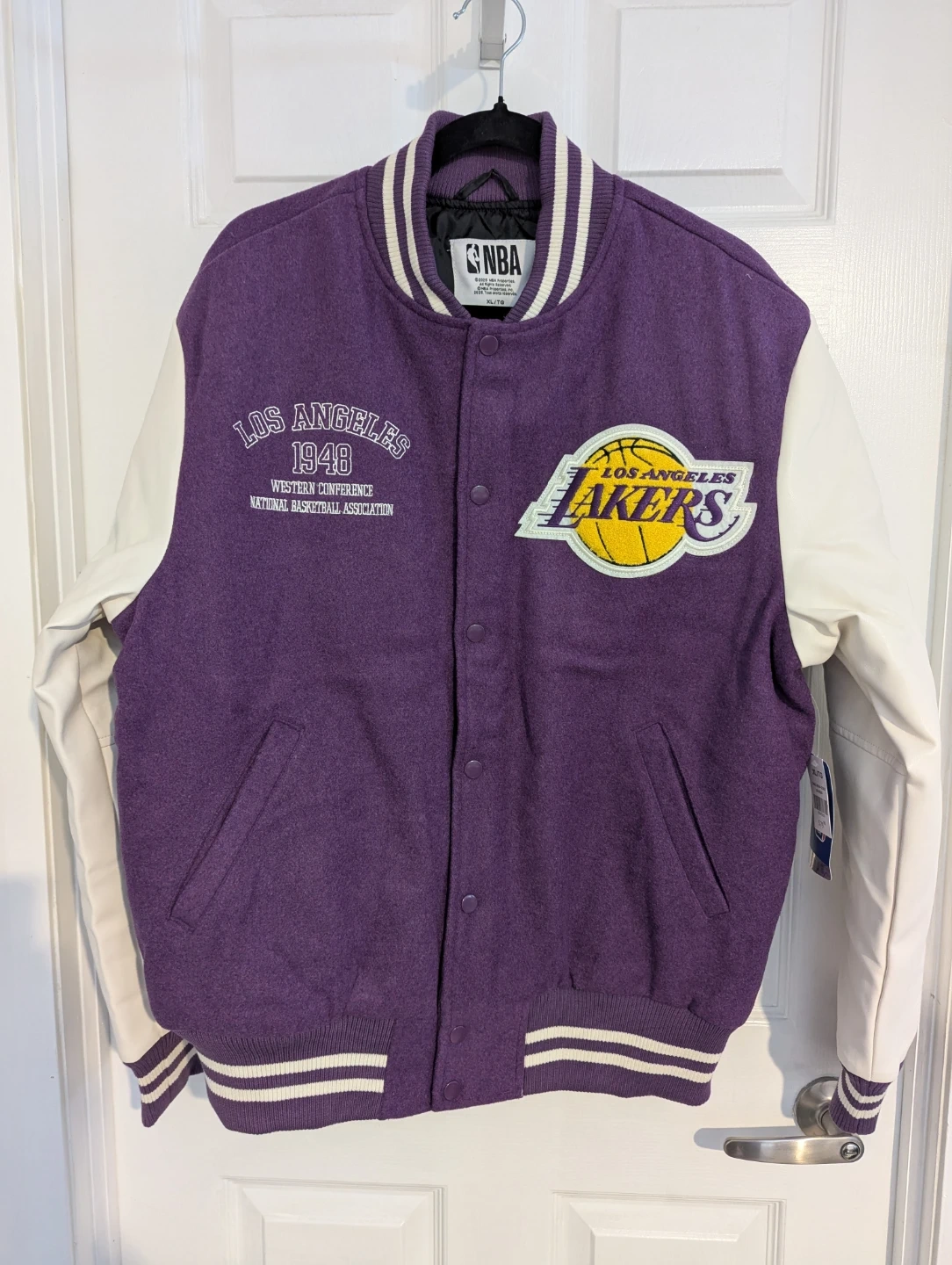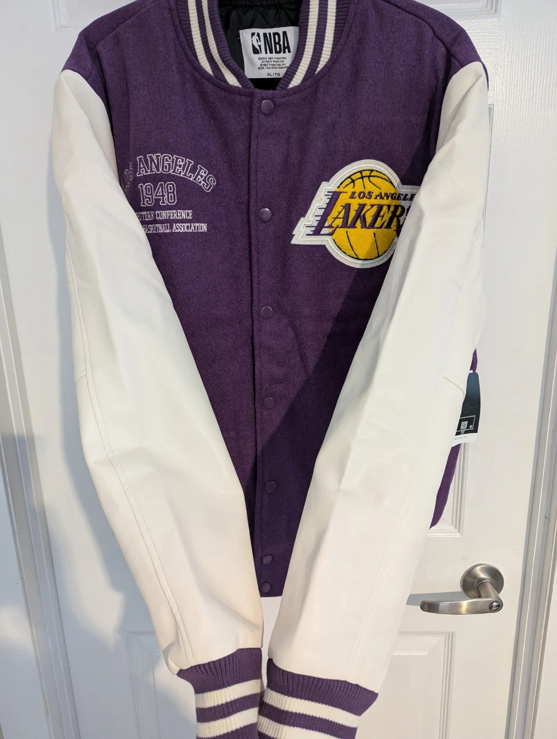 Brand new! NBA Los Angeles Lakers jacket. Purple wool body with white faux leather sleeves. Embroidery detailing. Size men's XL.