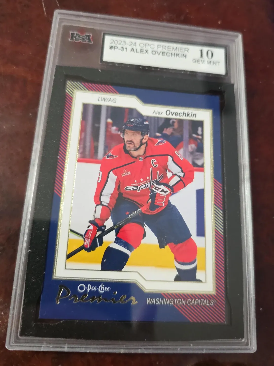 This is a 2023-24 OPC Premier Alex Ovechkin hockey card, graded Gem Mint 10. It's card #P-31 and features the Washington Capitals player. This card's a great addition for any collector!