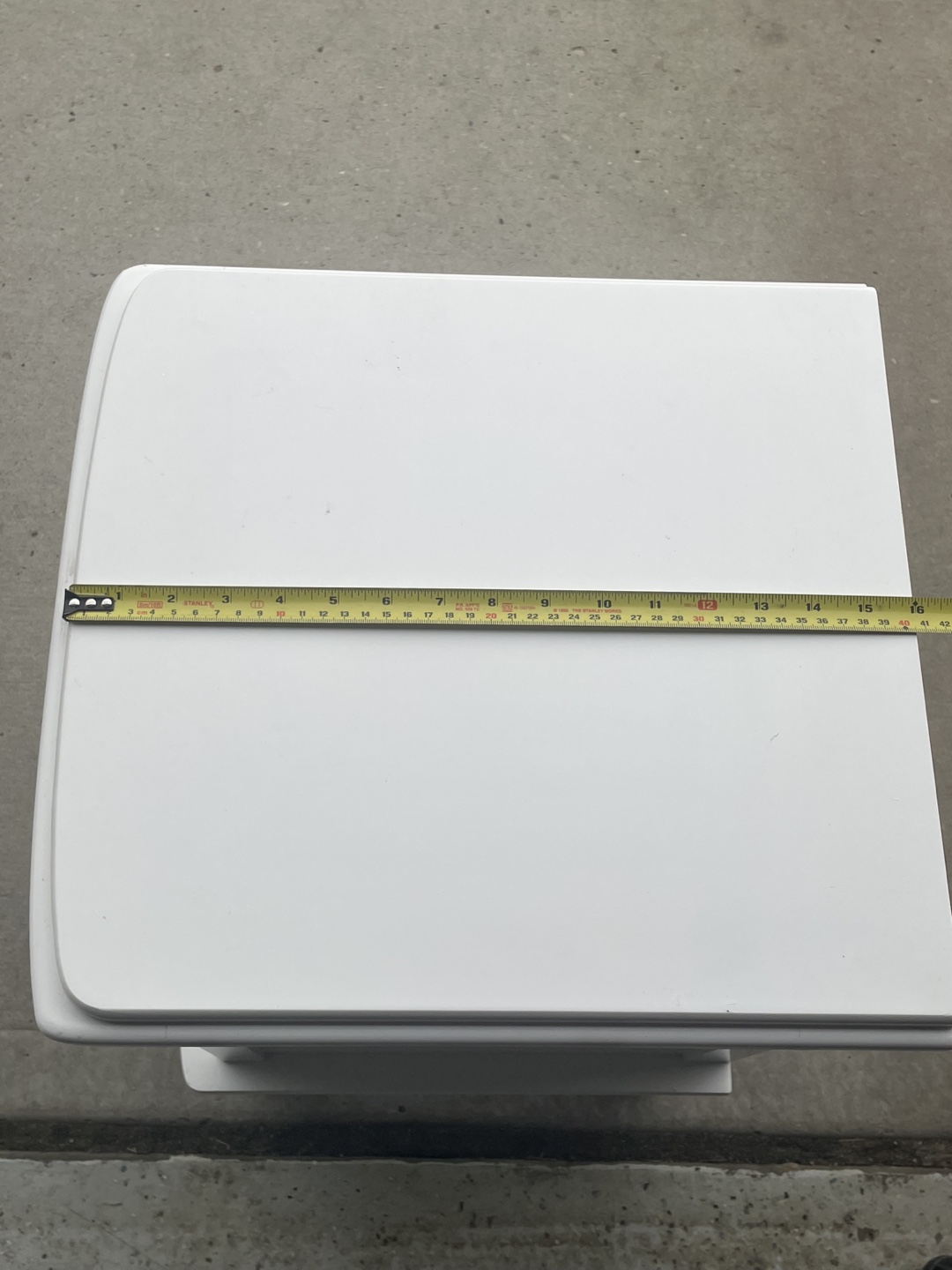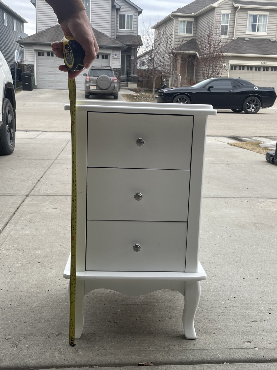Small white nightstand. Three drawers, silver knobs. Measures approximately 15” wide, 26” tall, and 16” long. A like new condition.