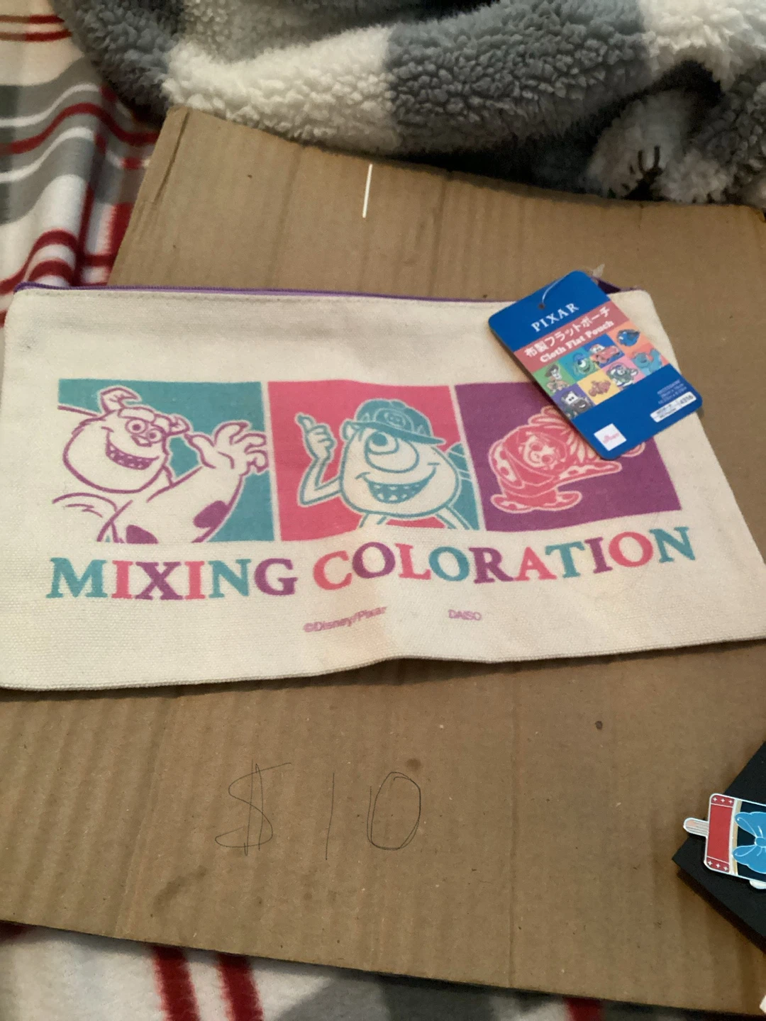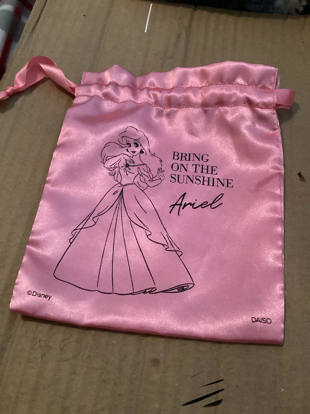 Canvas zipper pouch featuring Monsters Inc. characters Mike and Sulley. Comes with a purple zipper closure. Satin drawstring bag with Ariel graphic and ribbon tie.