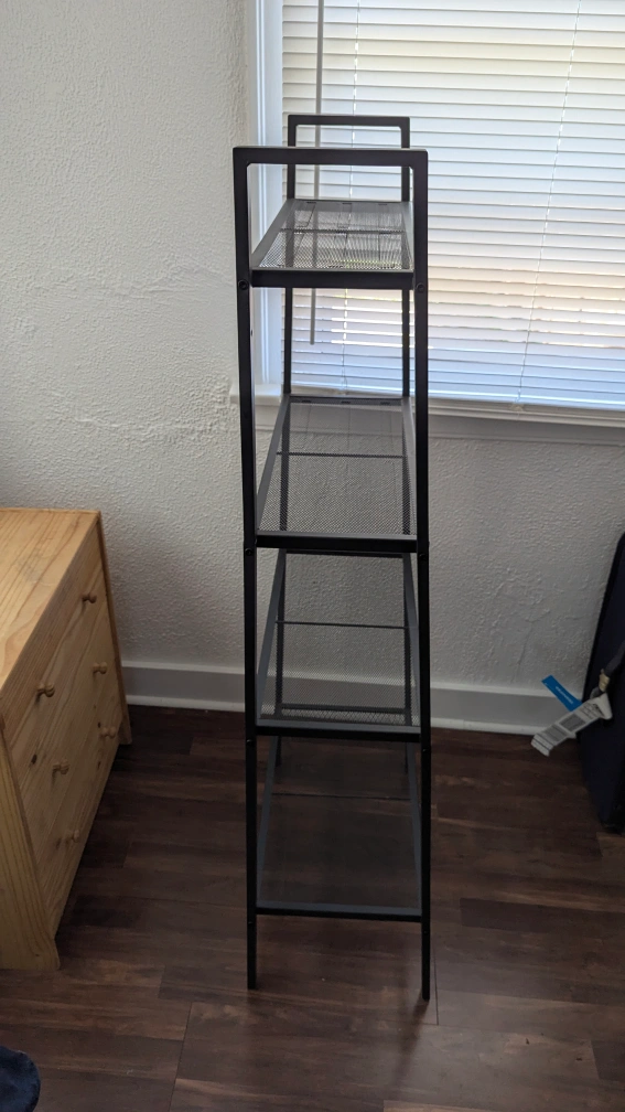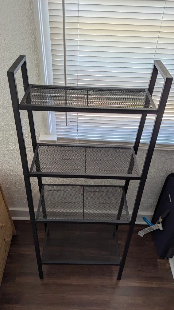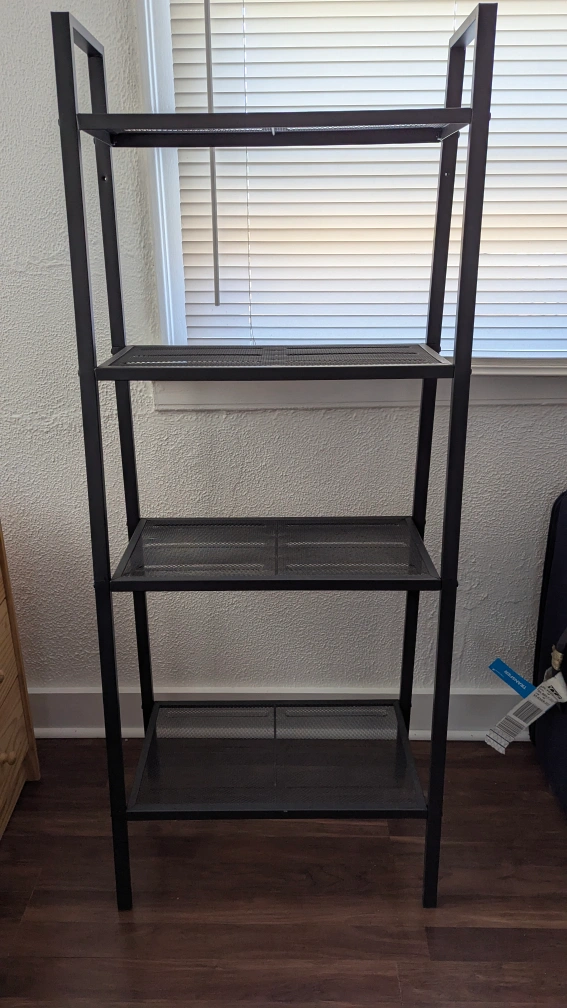 Selling a black metal four-tier shelf. It's in great condition and perfect for adding some extra storage to any room! The shelf is sturdy and stylish, with a modern, minimalist design. It would be a great addition to your home!