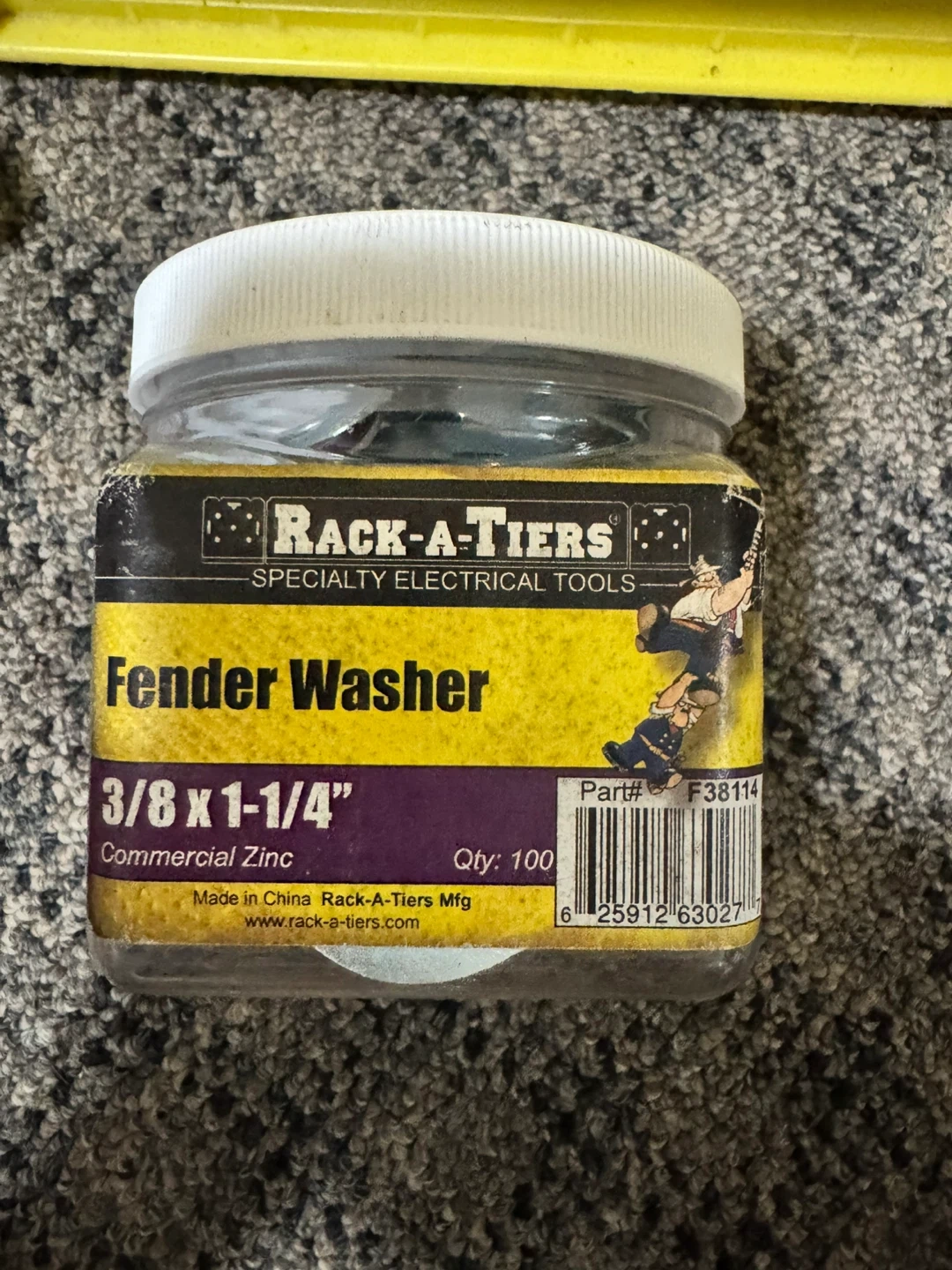 Selling a jar of Rack-A-Tiers Fender Washers. They are 3/8 x 1-1/4" and made of commercial zinc. The jar contains a quantity of 100 washers. Part number F38114