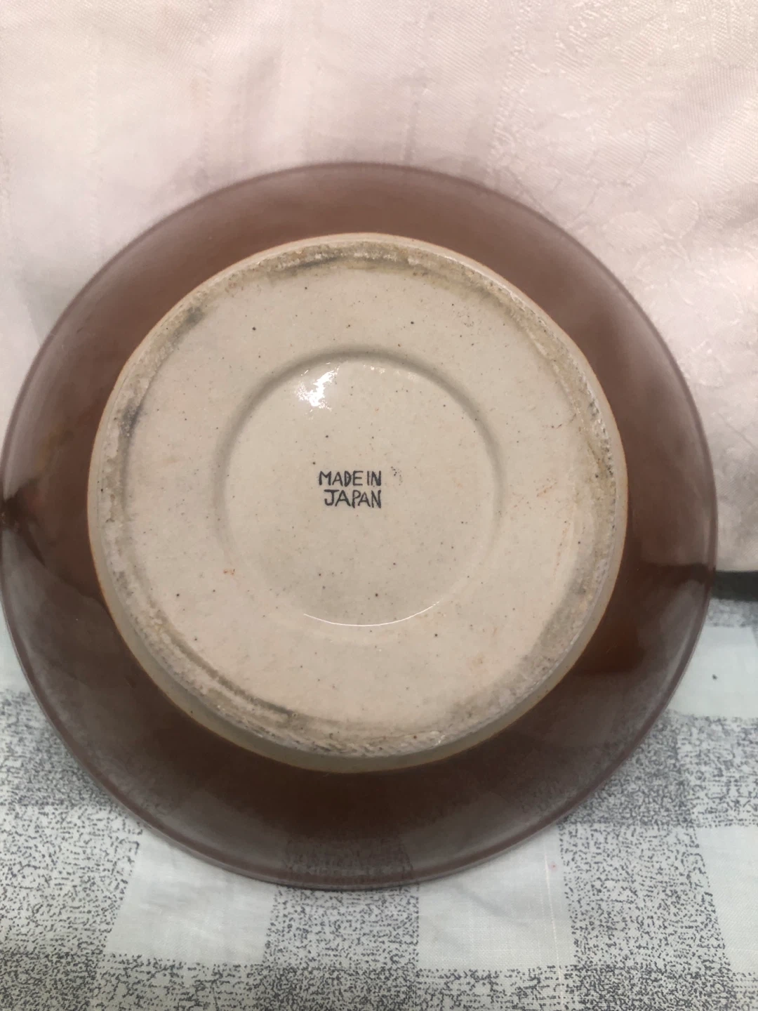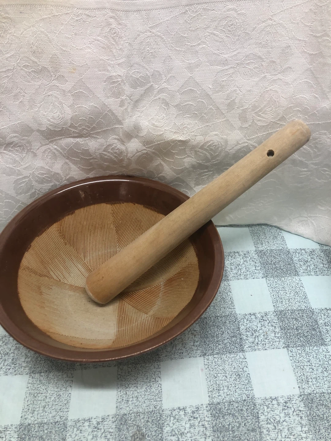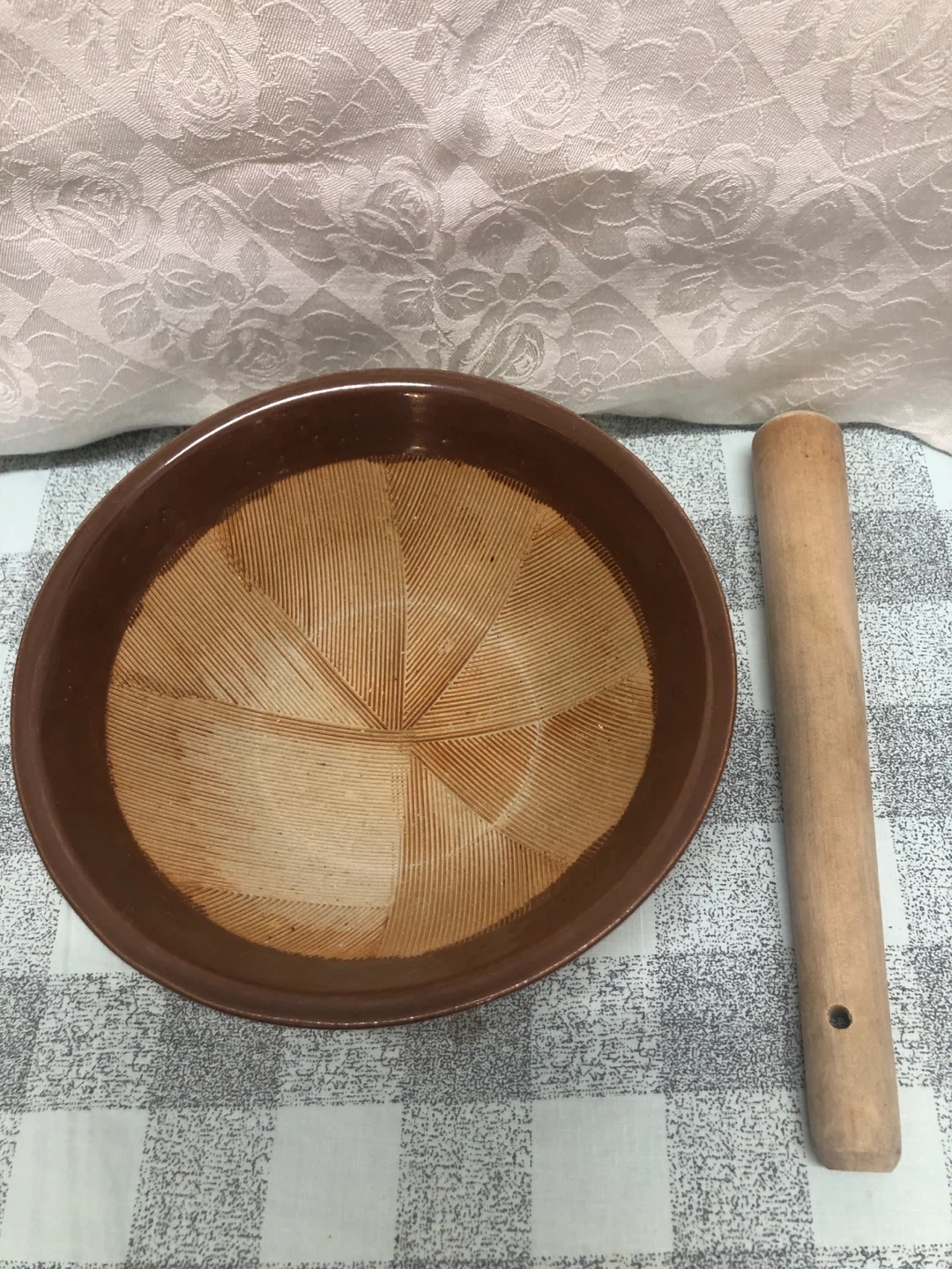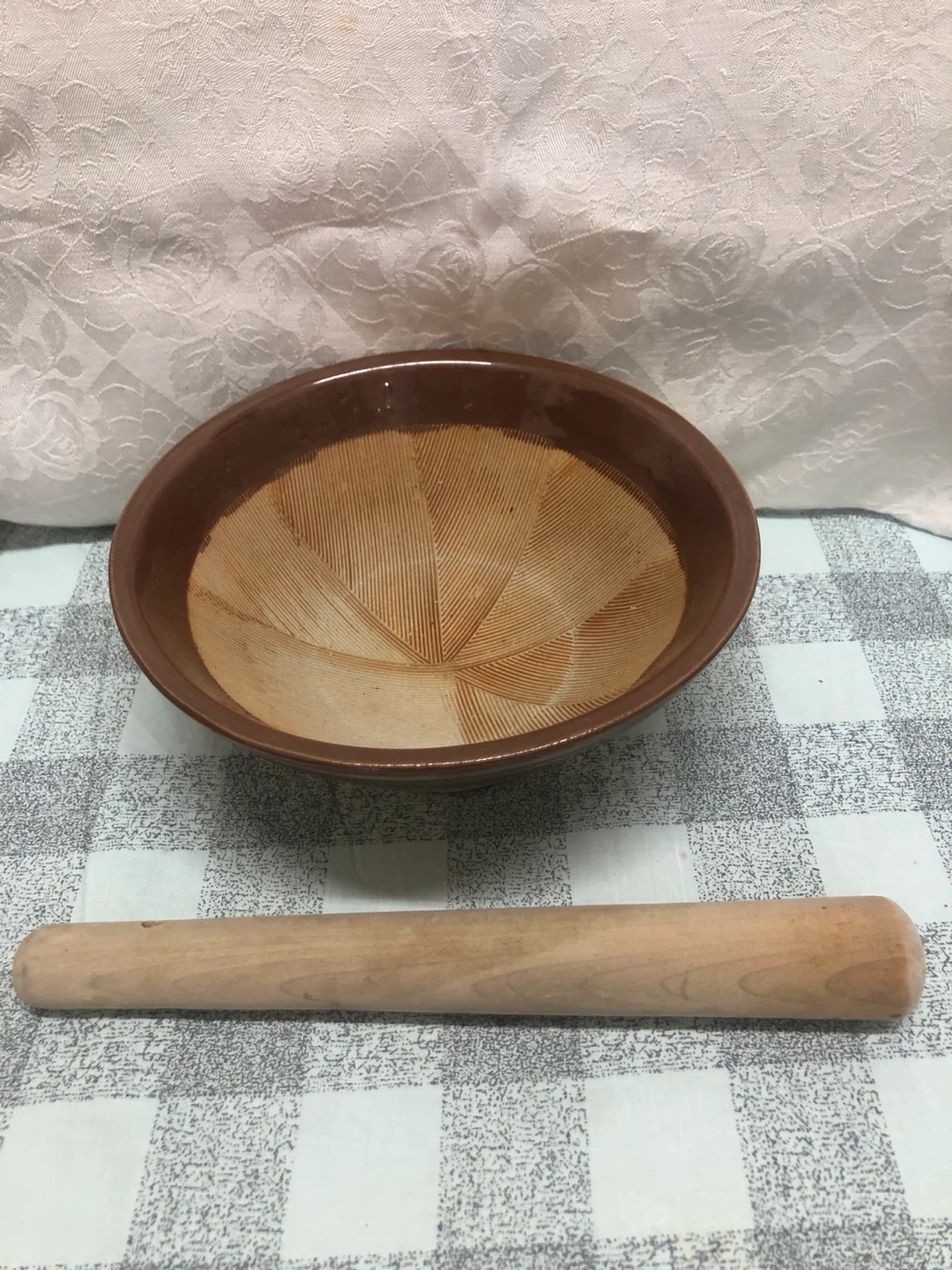 This is a brown ceramic mortar and pestle set. It's made in Japan and features a ribbed interior for grinding. The pestle is wooden and has a hole at one end. Perfect for grinding spices, such as sesame seeds or herbs!
