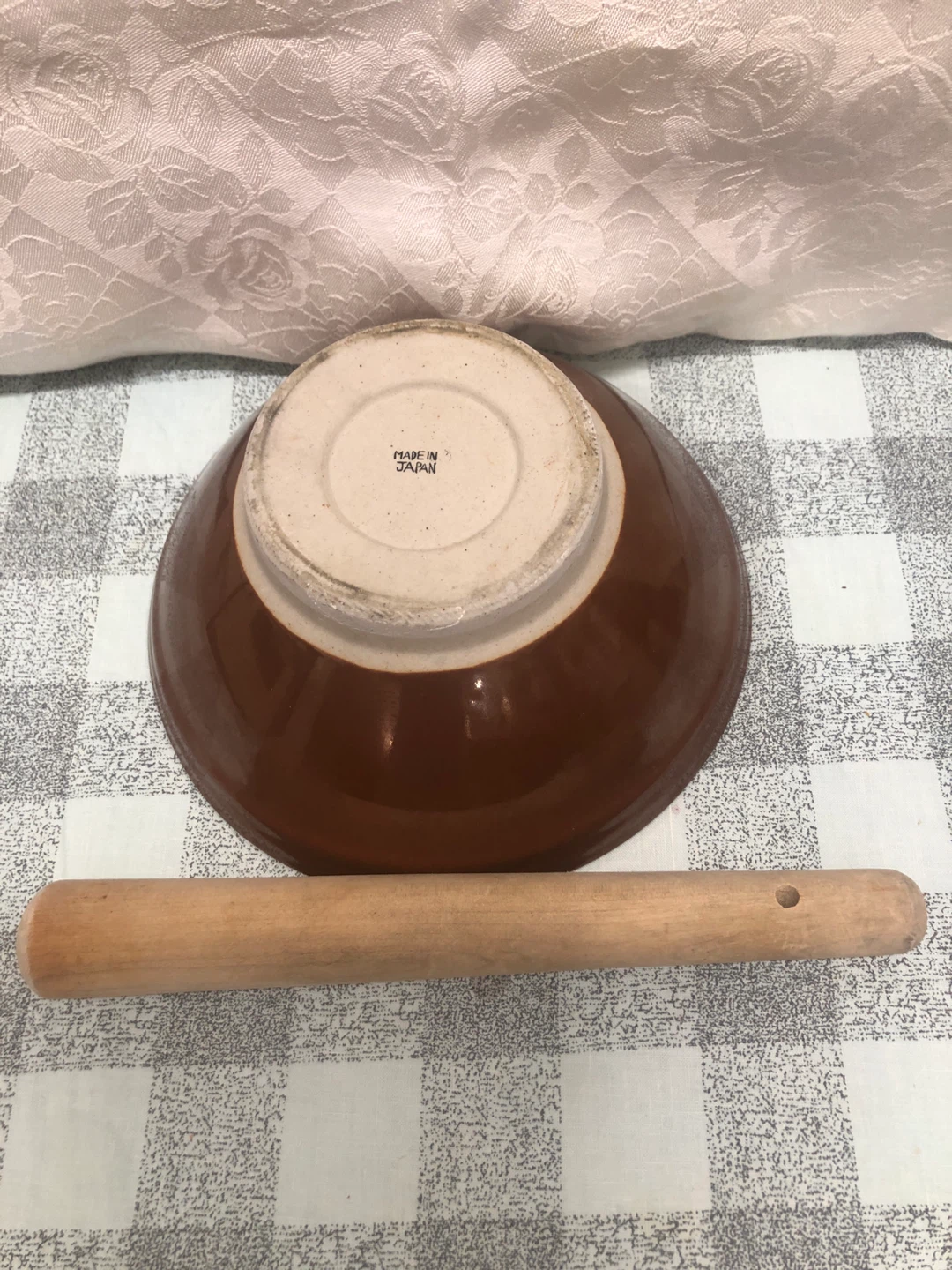 This is a brown ceramic mortar and pestle set. It's made in Japan and features a ribbed interior for grinding. The pestle is wooden and has a hole at one end. Perfect for grinding spices, such as sesame seeds or herbs!