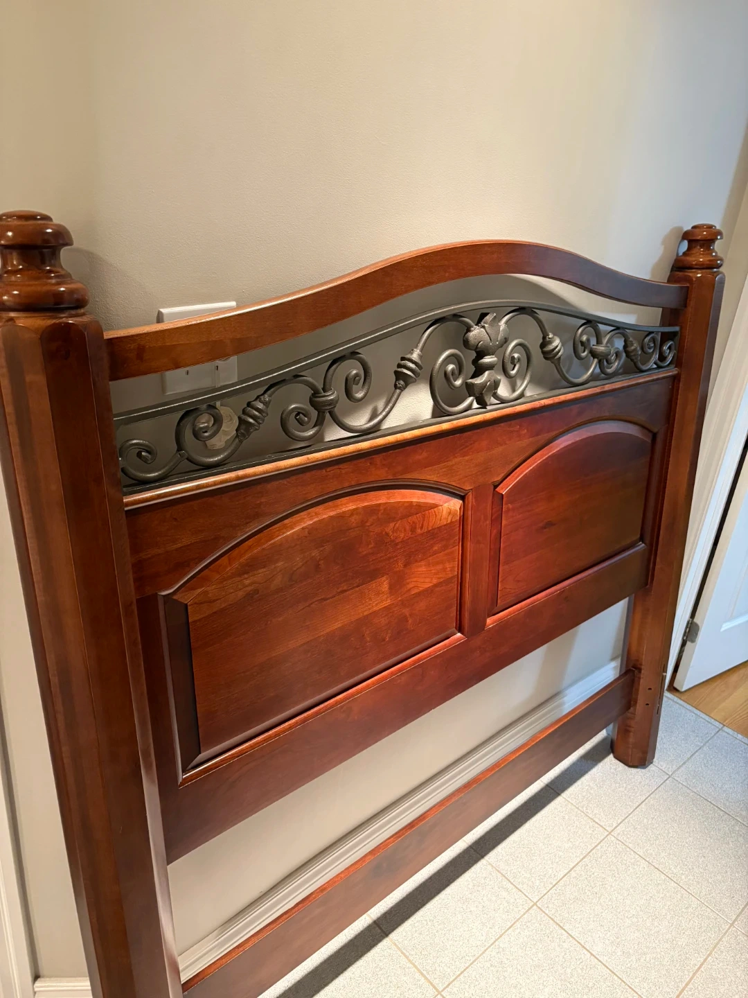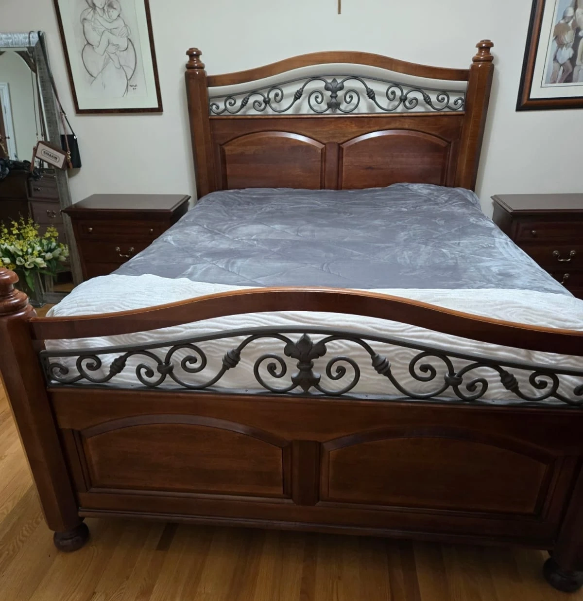 This is a dark solid wood queen-size bed frame. It features a beautiful headboard with detailed metal scrollwork. The frame has matching wooden side rails and footboard. It's a sturdy and elegant piece for any bedroom!