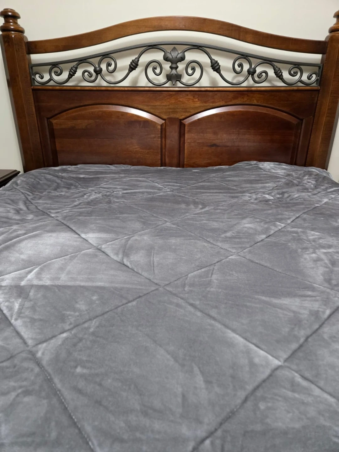 This is a dark solid wood queen-size bed frame. It features a beautiful headboard with detailed metal scrollwork. The frame has matching wooden side rails and footboard. It's a sturdy and elegant piece for any bedroom!