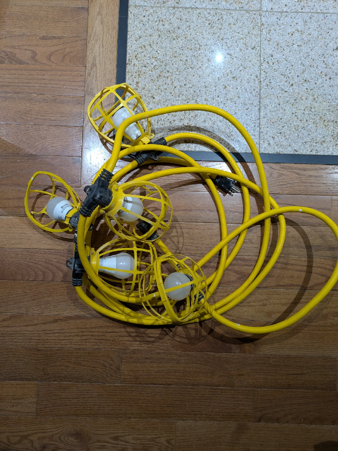 515Selling a set of string work lights, each with a protective cage around the bulb. Great for construction or any job site where you need extra light!