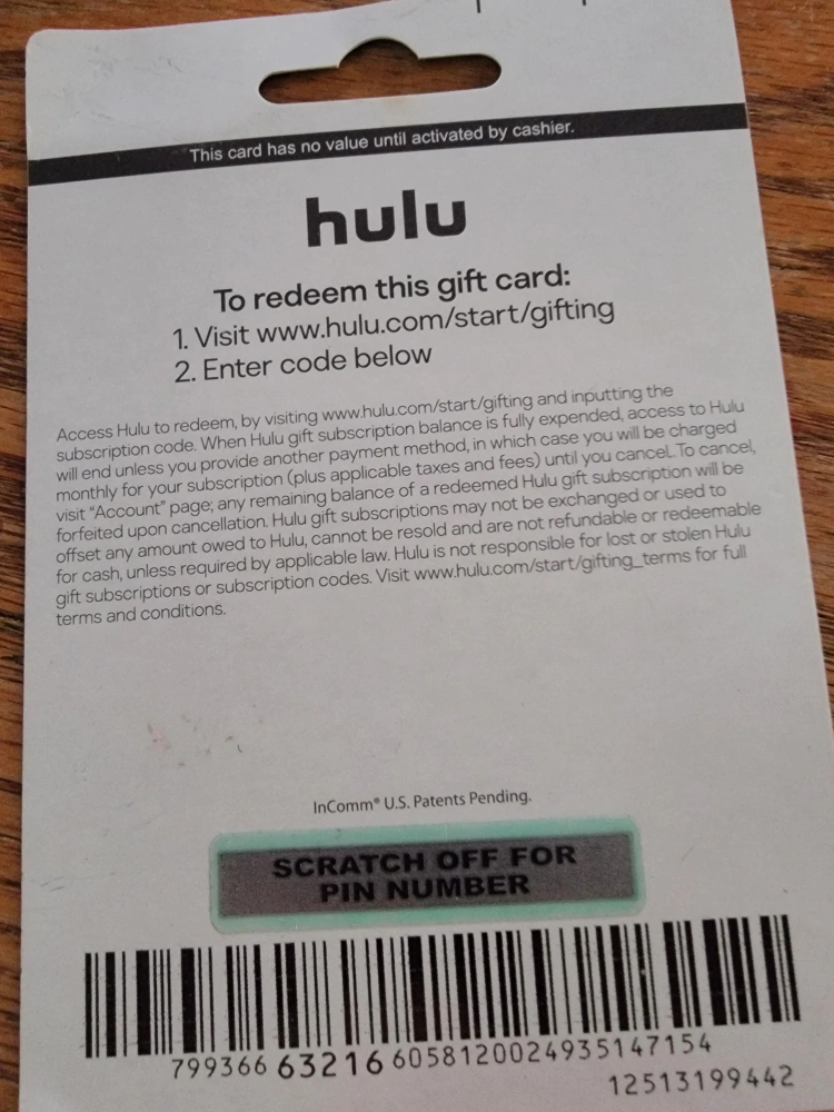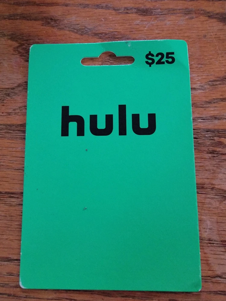 Unused $25 Hulu gift card. Redemption instructions on back. need VPN to use