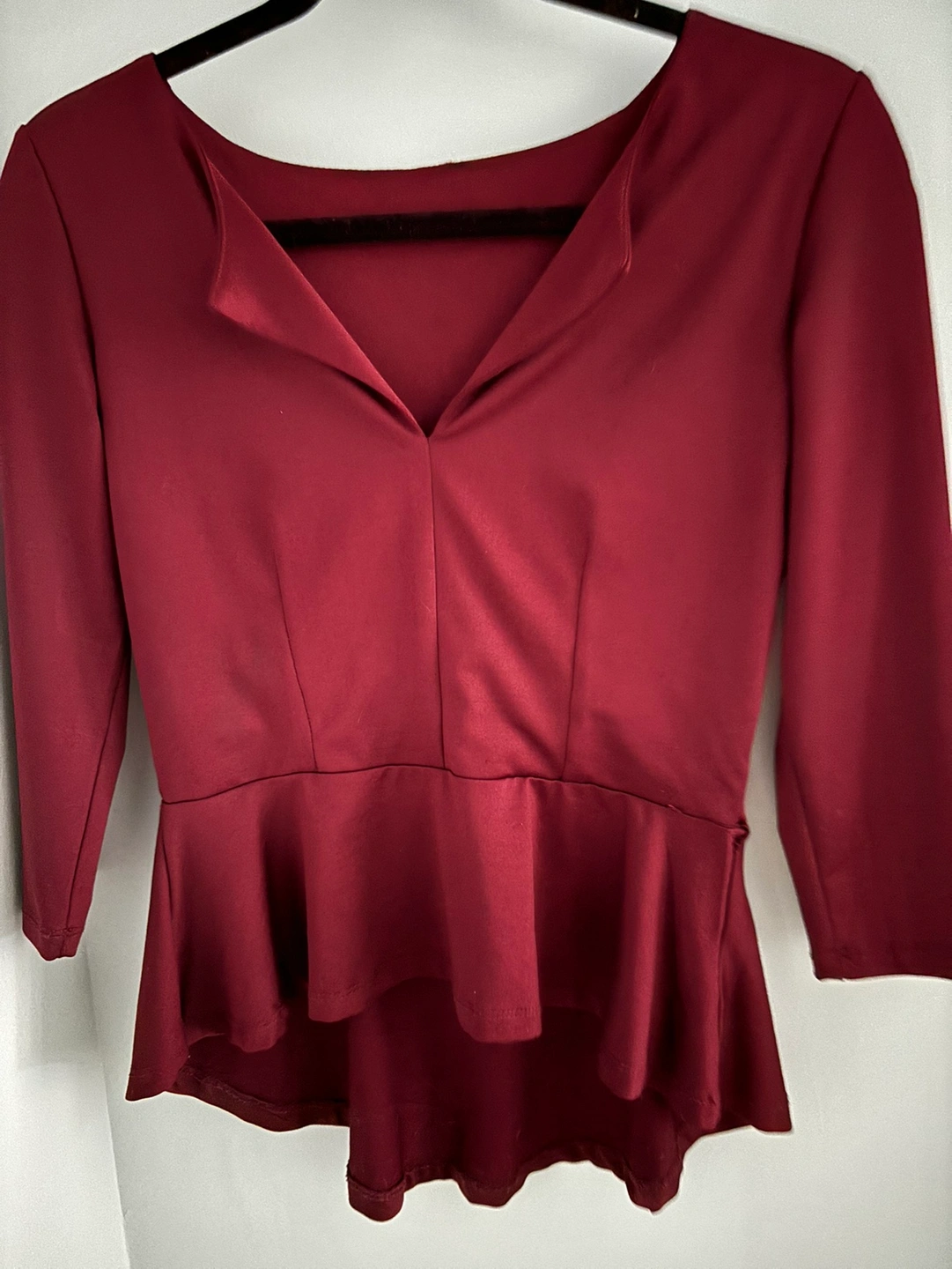 Designer Lab: vey stretchy, size S, worn only a couple of times. Made in USA. Stylish burgundy peplum top, three-quarter sleeves. Open neckline. Orange lightweight cardigan: mid length sleeve and sheer fabric, size M. Take all 3 for $5, or $3 for the Designer Lab long sleeve, $2 each for the other two. Click on my name and scroll down to see my other listings and pickup locations.