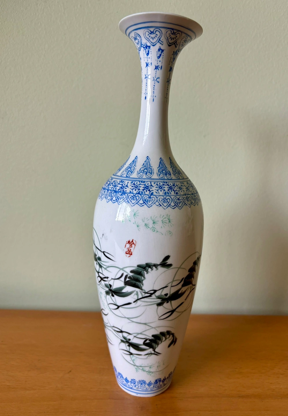 The vase is a beautiful piece of traditional Chinese pottery. In mint condition. It is a delicate and beautiful hand painted vase that is made of eggshell porcelain. It has a slender neck and a round body, and JINGDEZHEN" mark on the bottom, making it a unique and valuable collectible item. About 10”(26cm) tall. A storage 📦 is included.