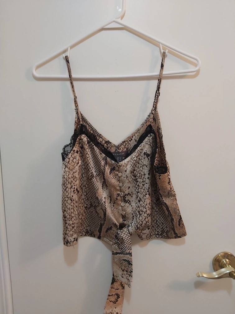 Type: Cheetah-like print top with lace lining; can tie a knot or bow in front; decorative buttons