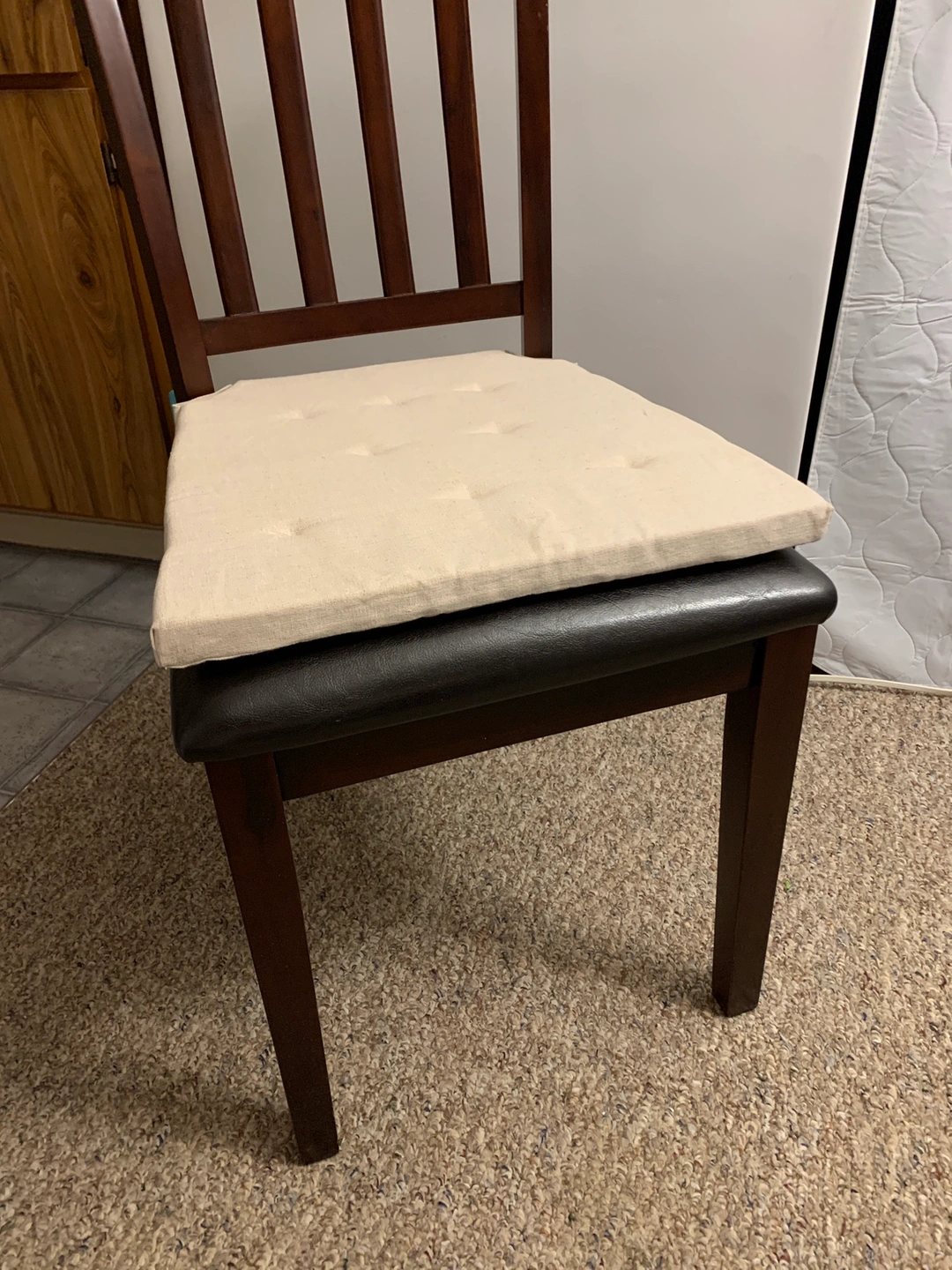 4 new, never used IKEA chair cushions. Natural linen flax colour. Approx 17” square but tapered narrower at back end that attaches to chair, 1” thick.