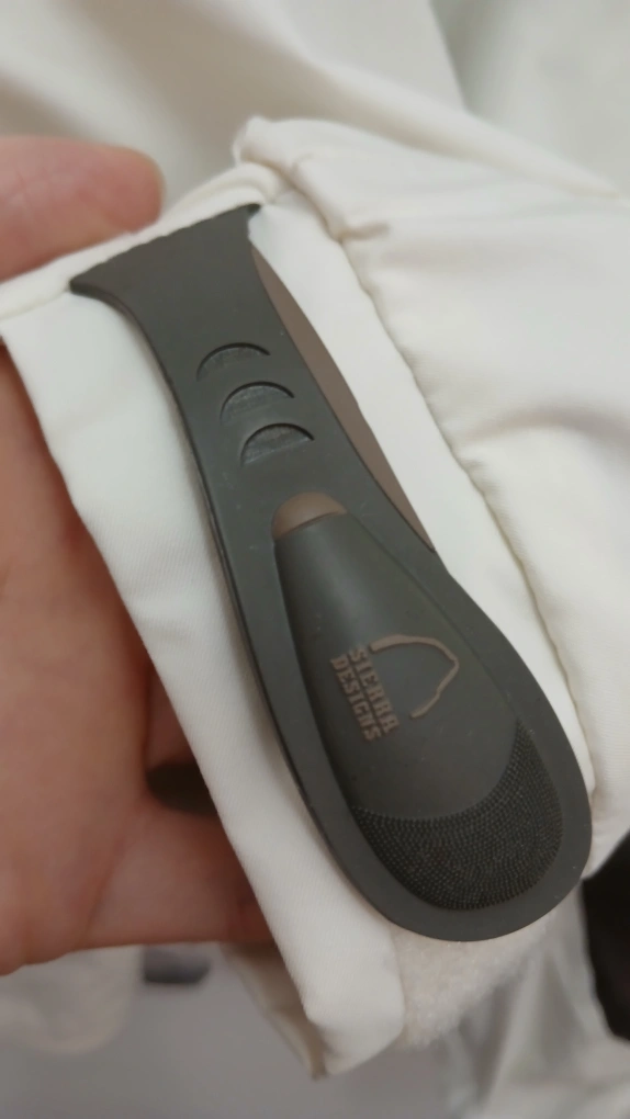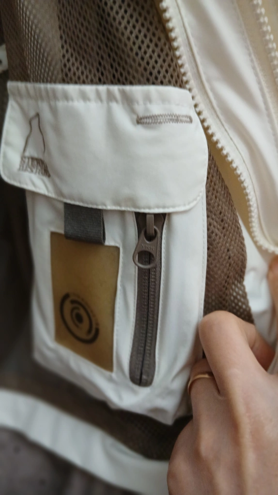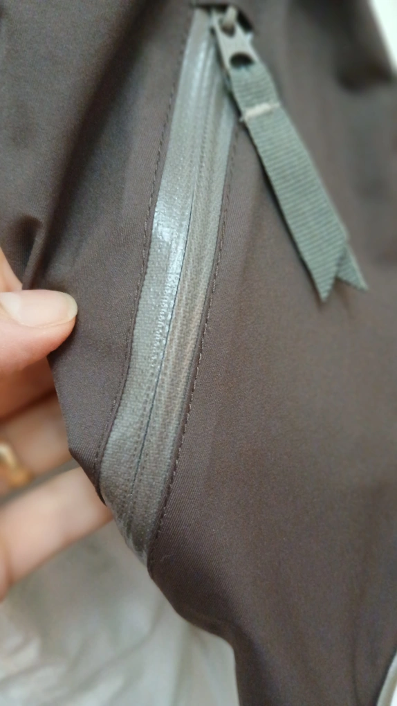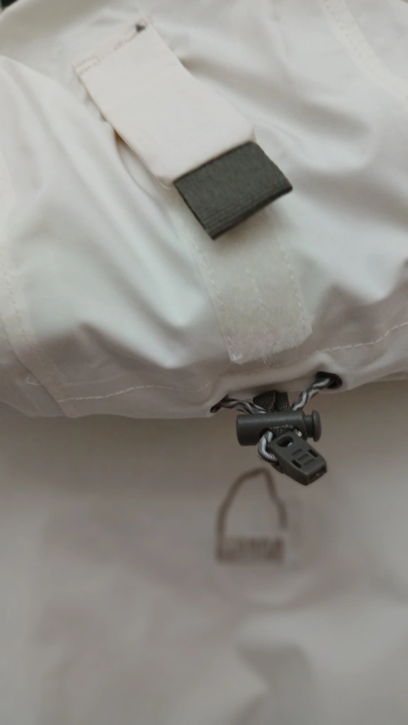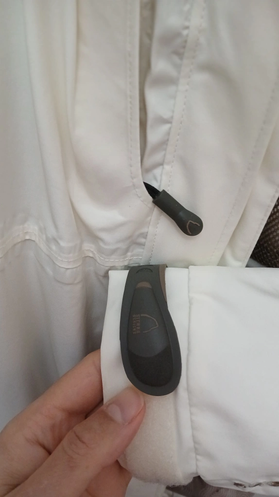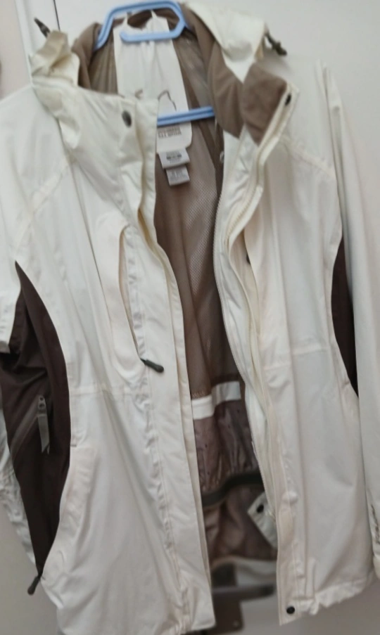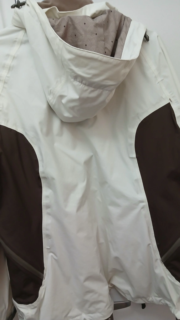 Women's medium ski jacket. Off-white with brown accents. Features a hood and zippered pockets. Water resistant.