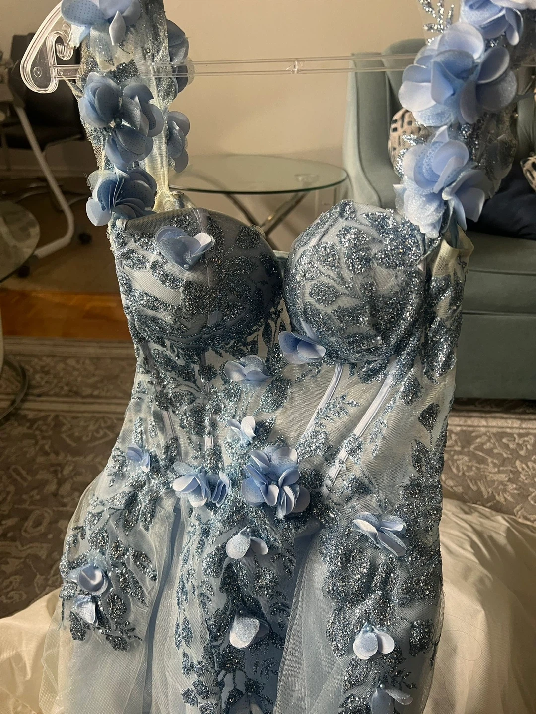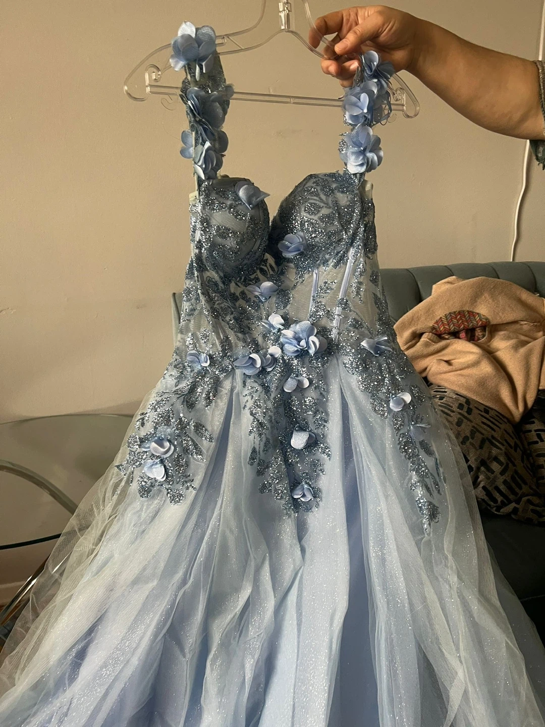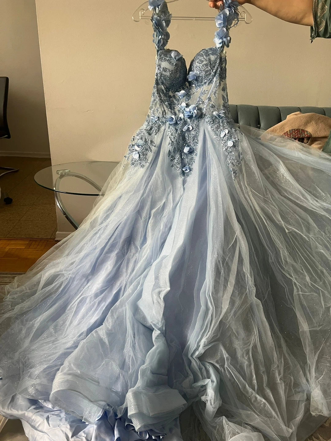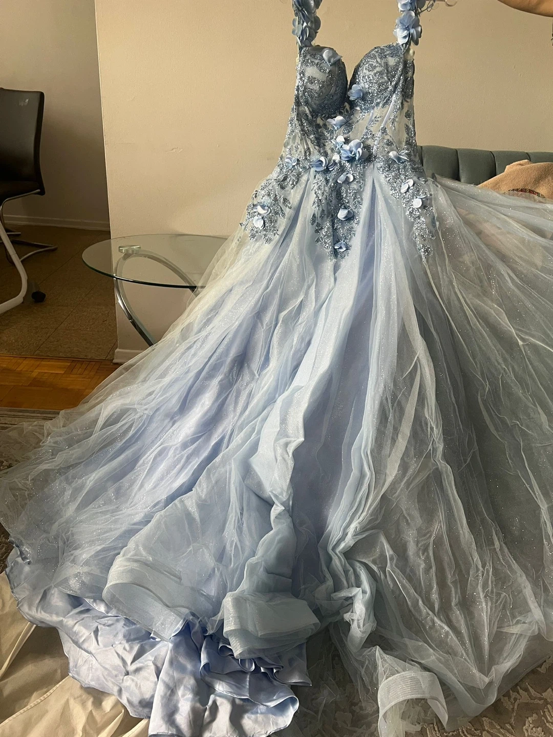 Beautiful light blue gown with floral appliqués. It features a fitted bodice and a flowing tulle skirt. Perfect for a special occasion!