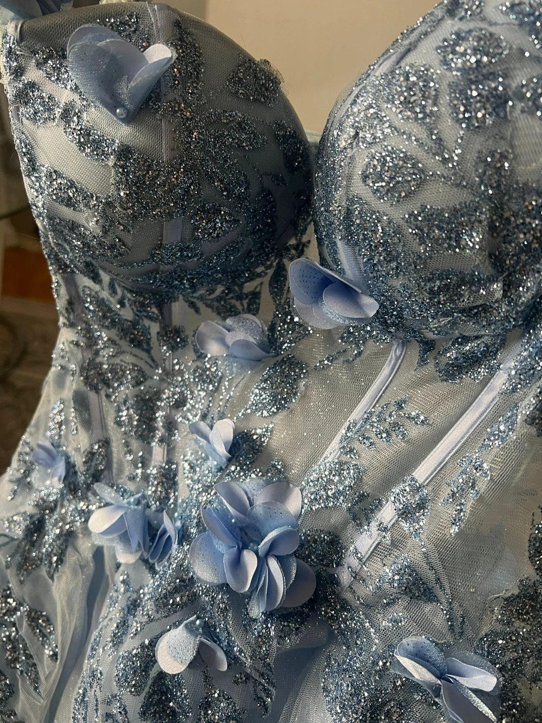 Beautiful light blue gown with floral appliqués. It features a fitted bodice and a flowing tulle skirt. Perfect for a special occasion!