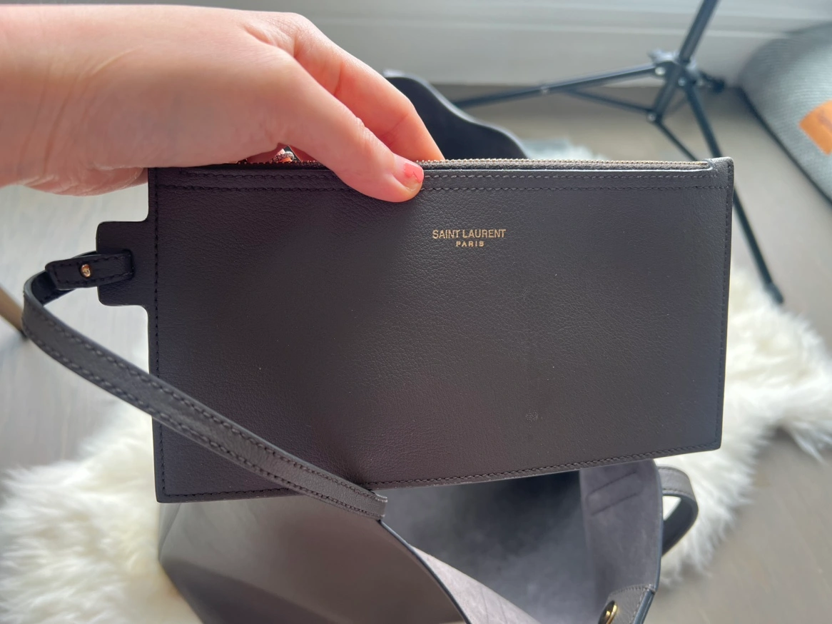 This is the east west tote bag from Saint Laurent. It has been pre-loved but still has a lot of life left. The only noticeable flaw is that one thread little bit coming out on the side. See picture. Comes with detachable pouch. No box or dust bag.