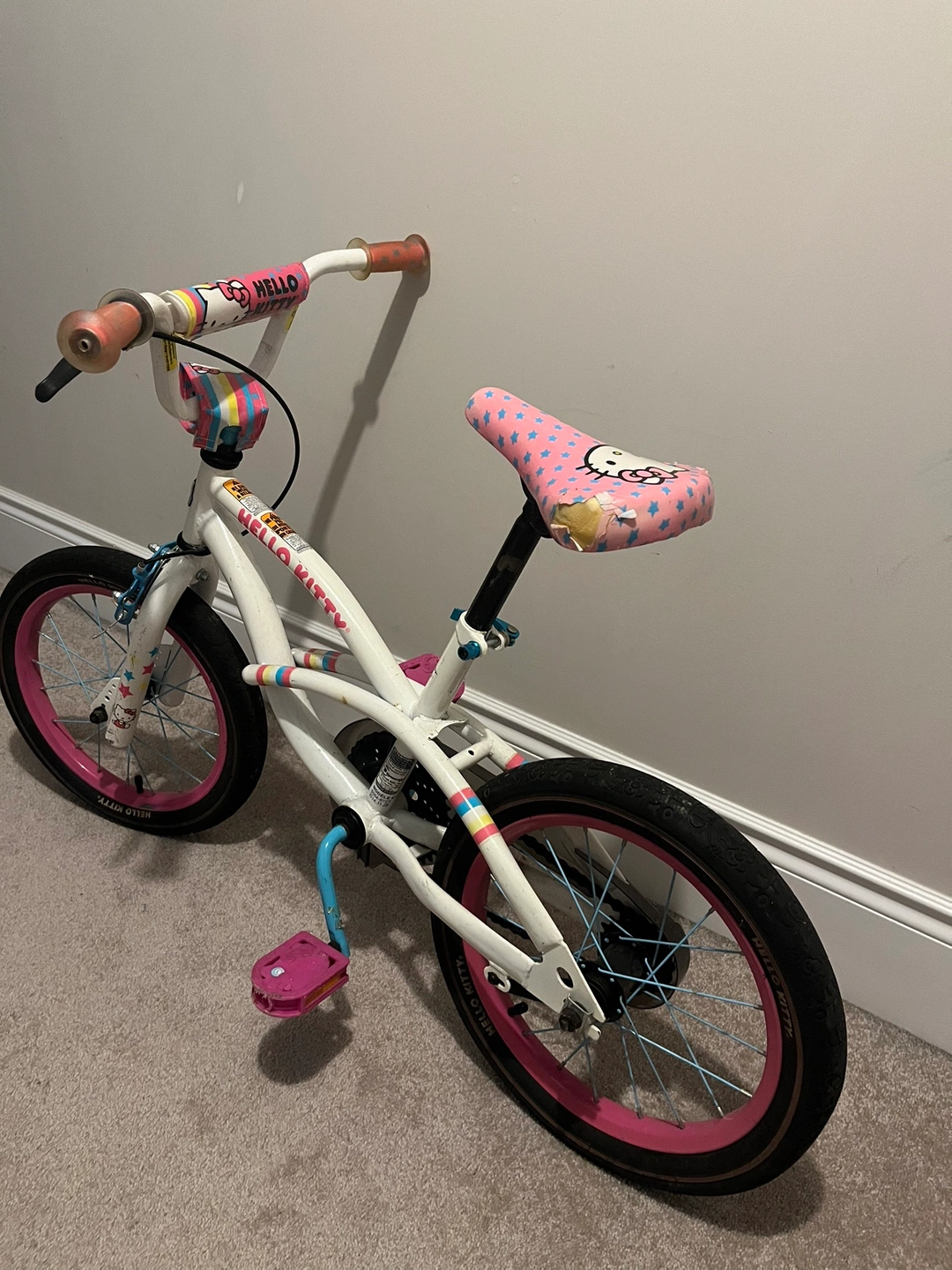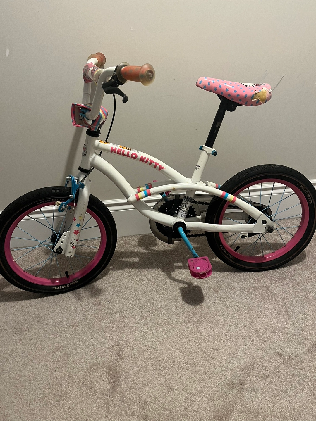 Good condition Hello Kitty bike with 16” wheels. Fits up to 7 years old depending on how tall your child is. Some wear on the seat but otherwise in good working order.