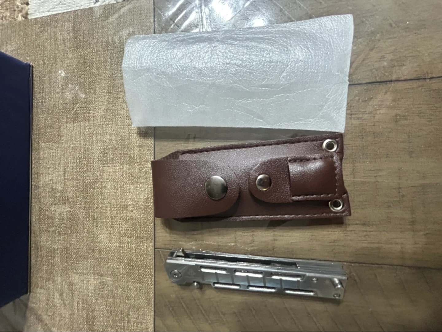 Silver butterfly knife trainer made of metal. It comes with a brown leather sheath and original packaging. Perfect for practicing flips and tricks safely!