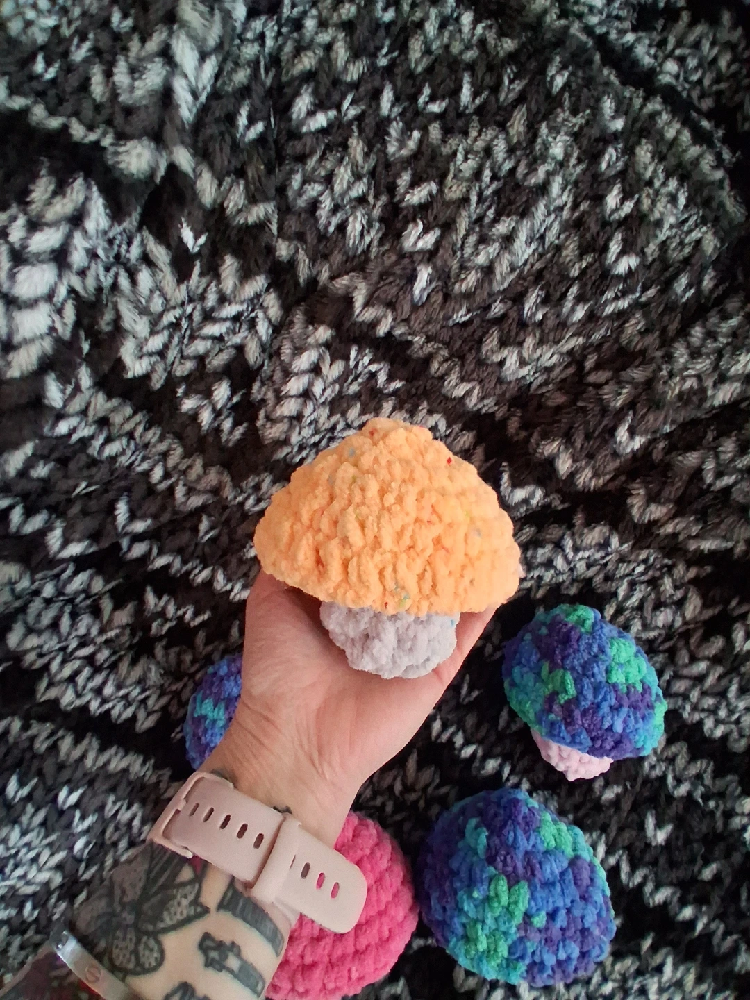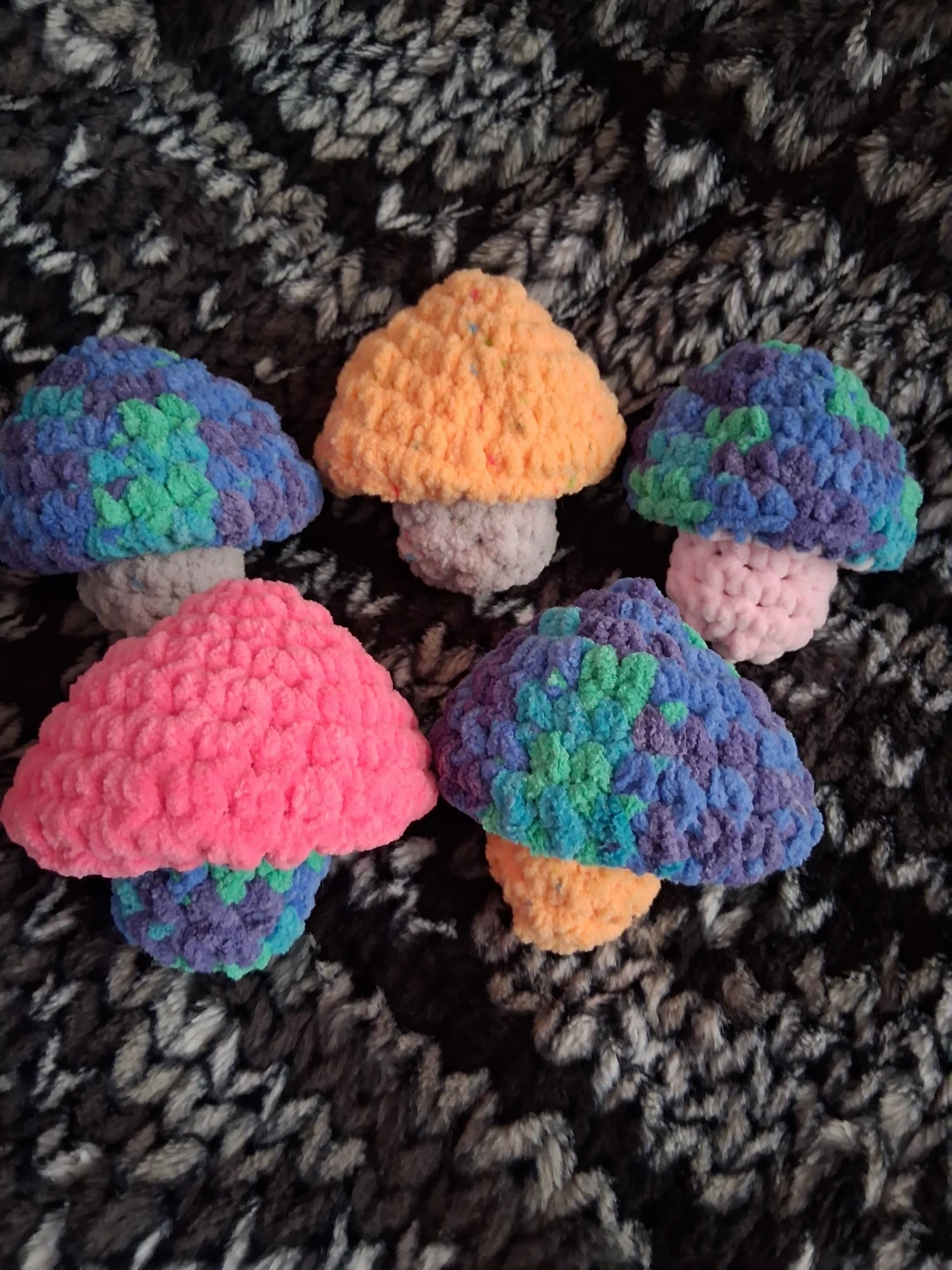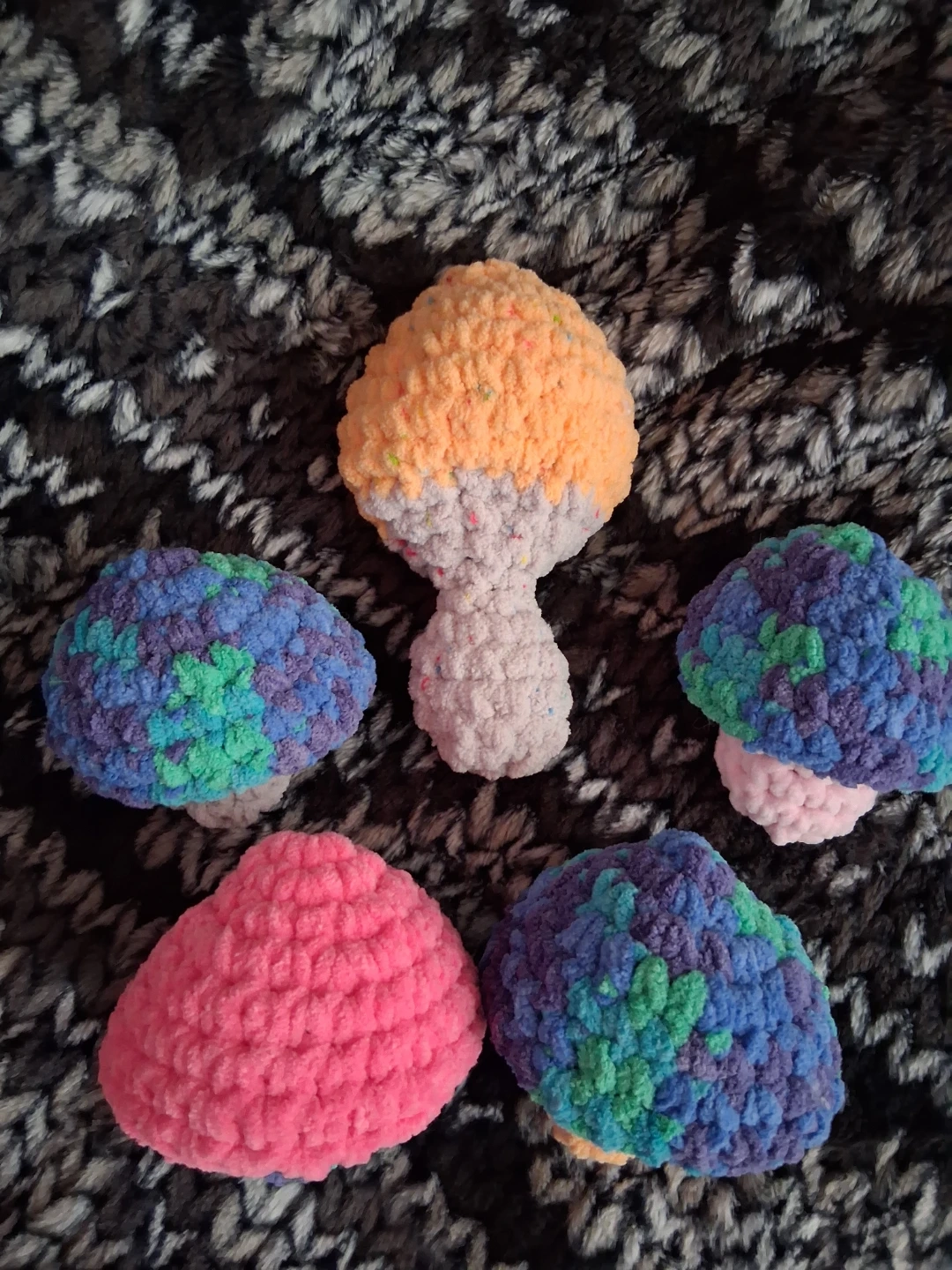 Cute handmade crochet mushroom plushies in various colours and sizes. These softies are perfect for decorating a shelf or as a fun desk buddy. Each plushie is made from chenille yarn.