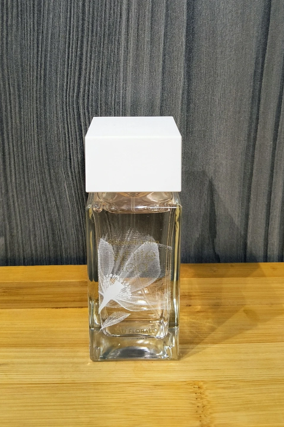 This is a Elizabeth Arden White Tea Eau Florale Eau de Toilette 50ml perfume. It comes in a clear glass bottle with a white cap. The bottle has a delicate feather design etched on the front.