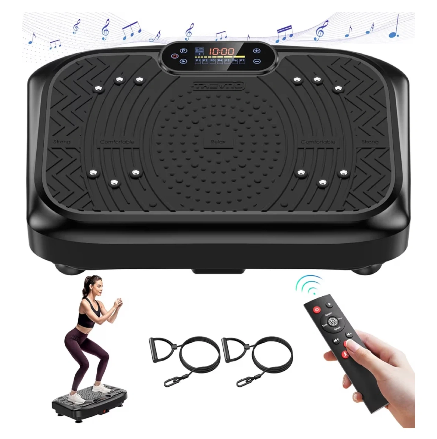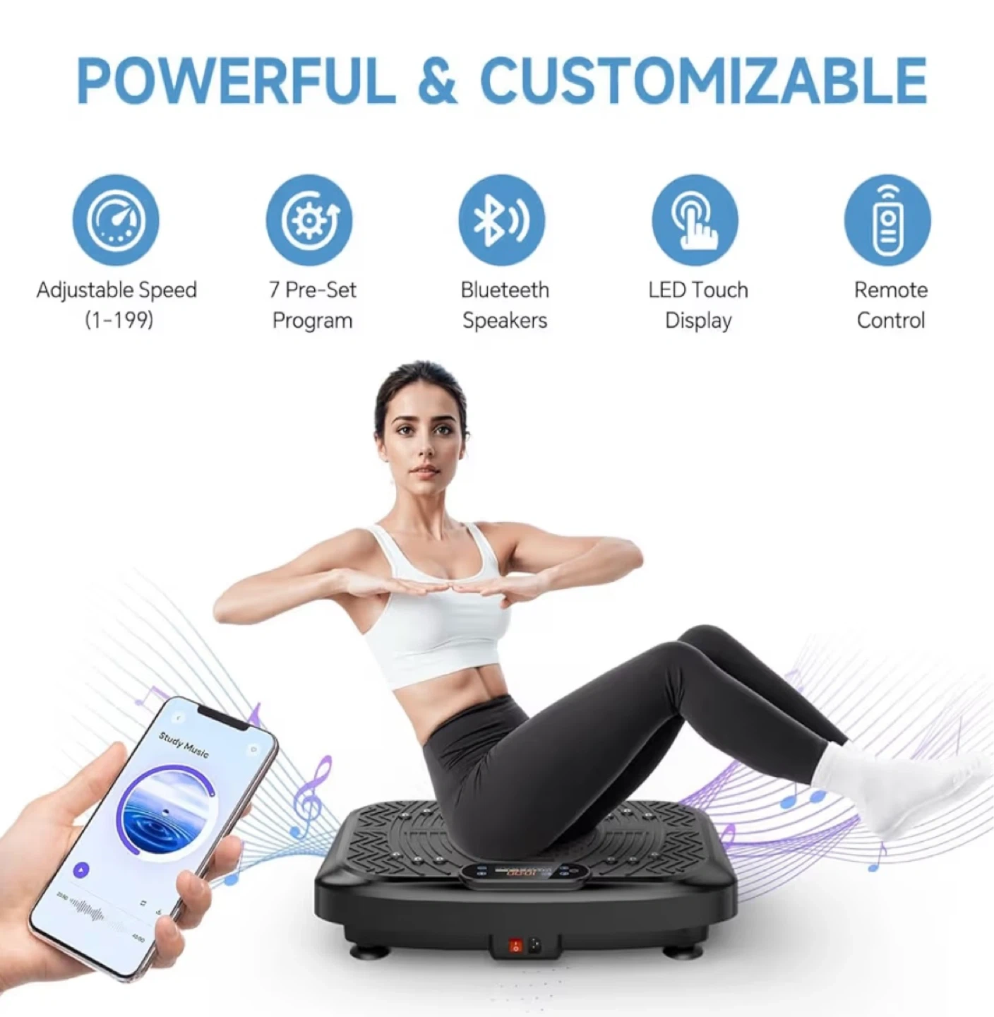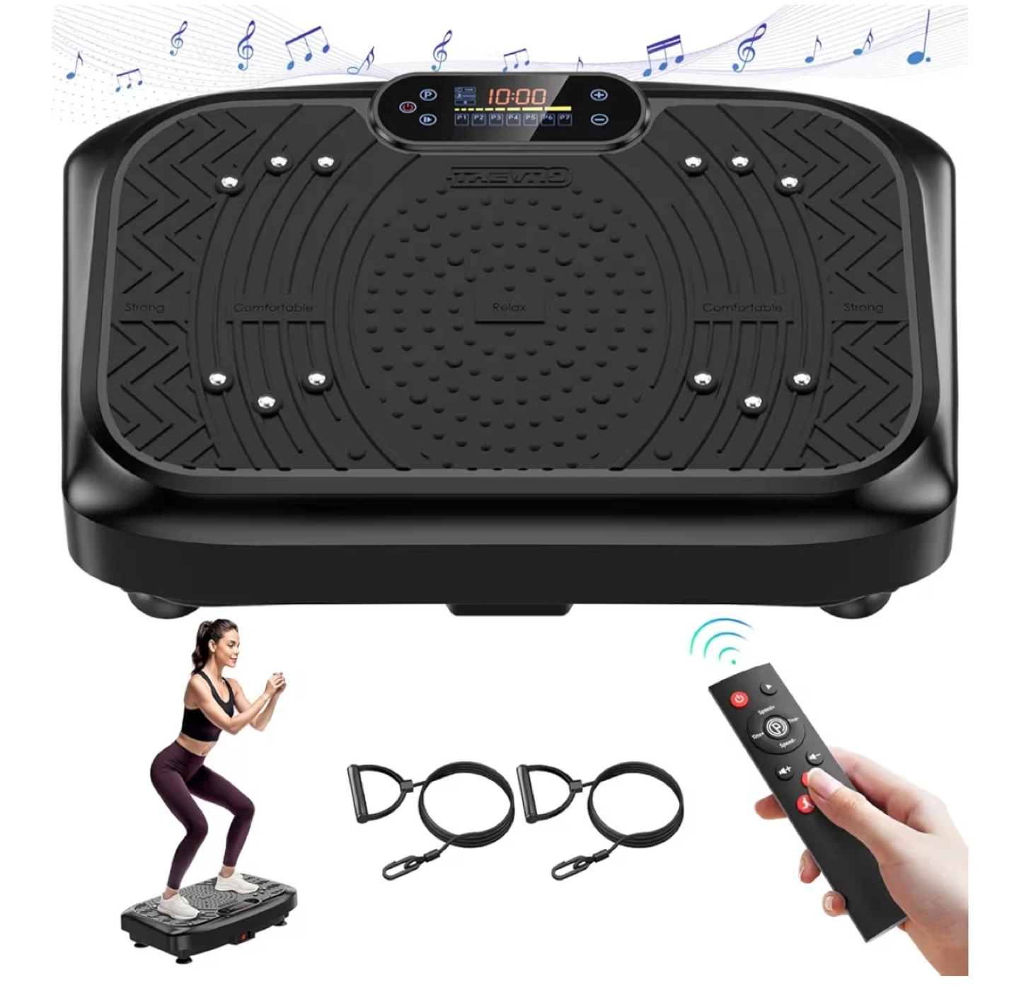 T This Taejro vibration plate exercise machine offers adjustable speed from 1 to 199. It features 7 pre-set programs, Bluetooth speakers, and an LED touch display. A remote control is also included for convenience.