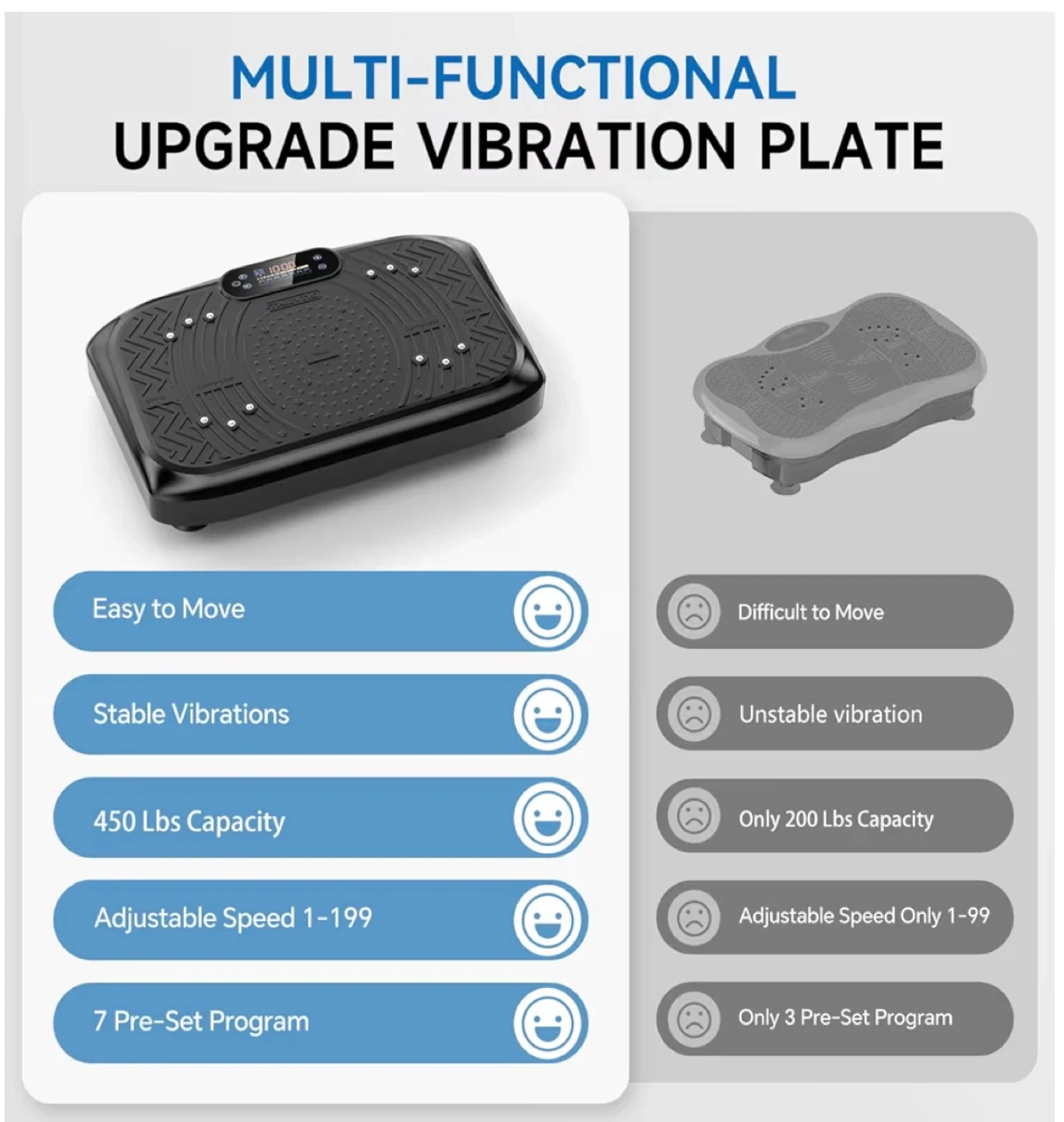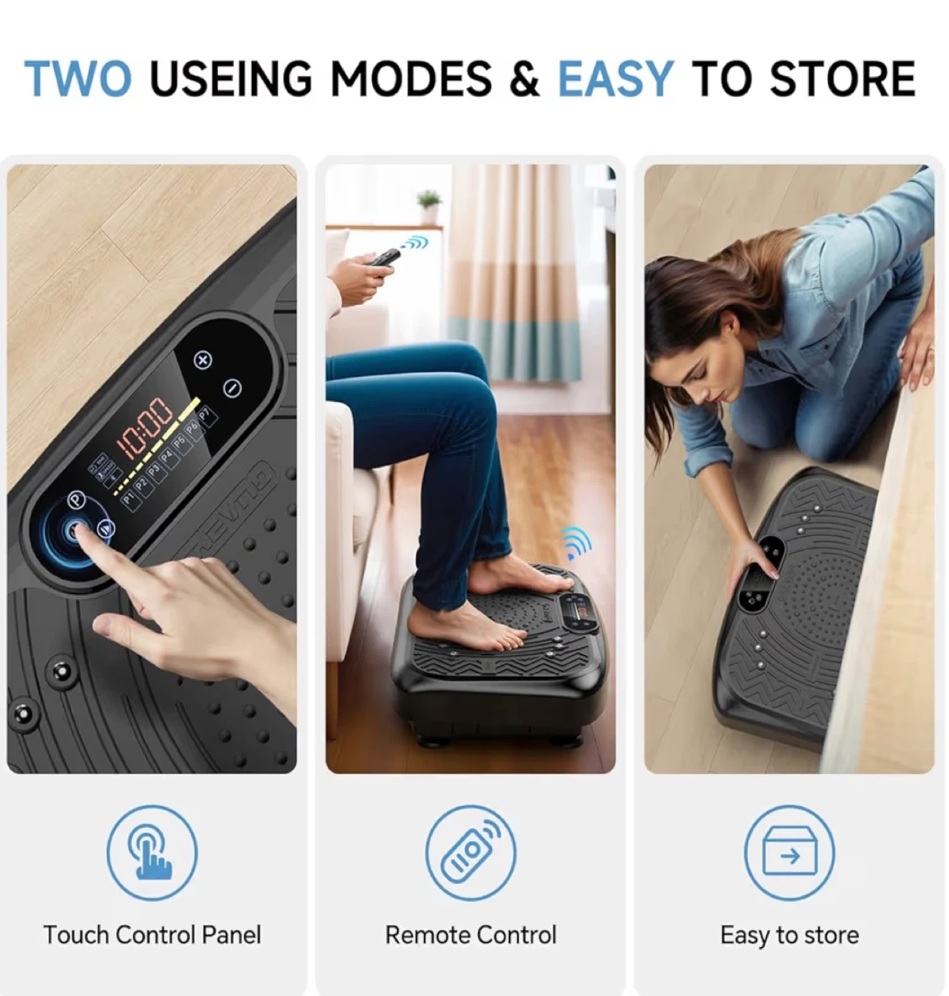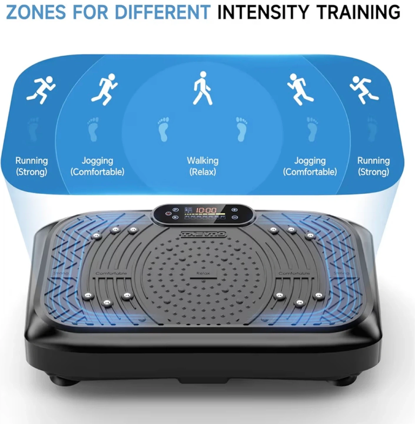 T This Taejro vibration plate exercise machine offers adjustable speed from 1 to 199. It features 7 pre-set programs, Bluetooth speakers, and an LED touch display. A remote control is also included for convenience.