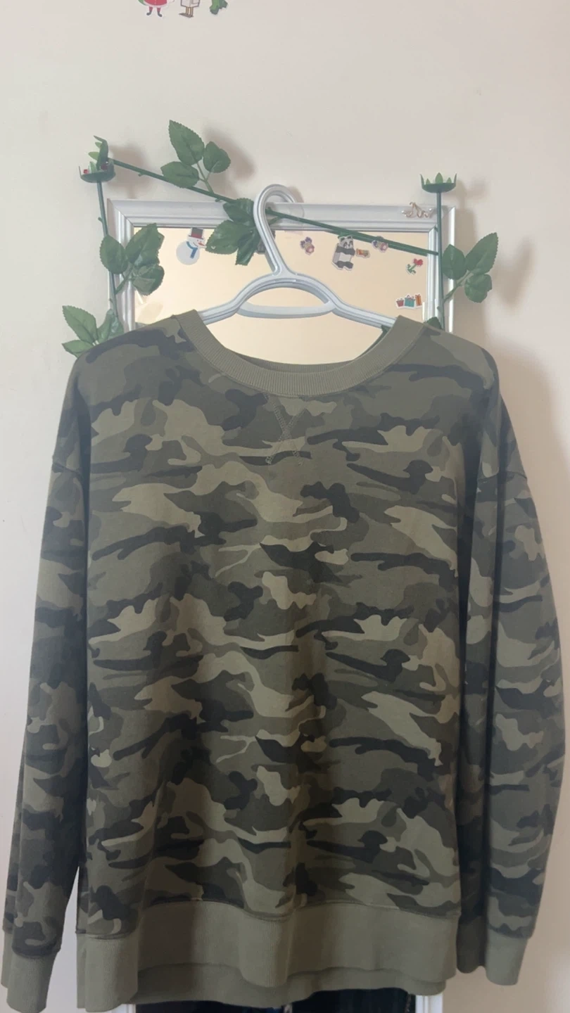 This is a camouflage crewneck sweatshirt. It's made of a comfortable cotton blend material. Perfect for casual wear any time of year!