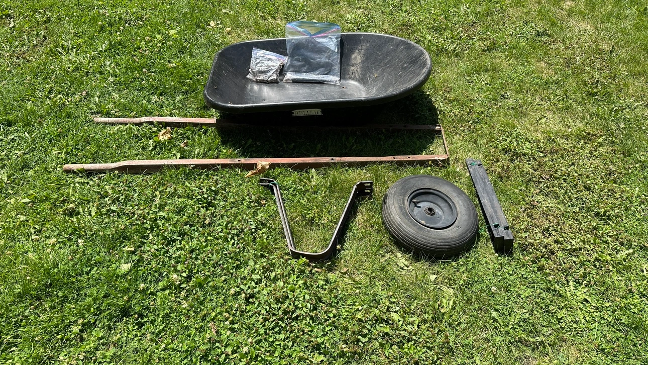 This was an extra wheelbarrow bought for gardening around the house, have another one now. I dismantled it for easy transportation, will need air in tire.
