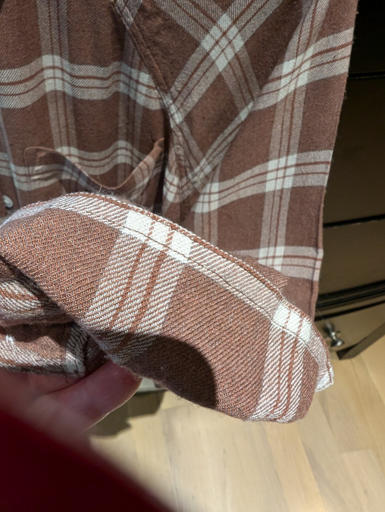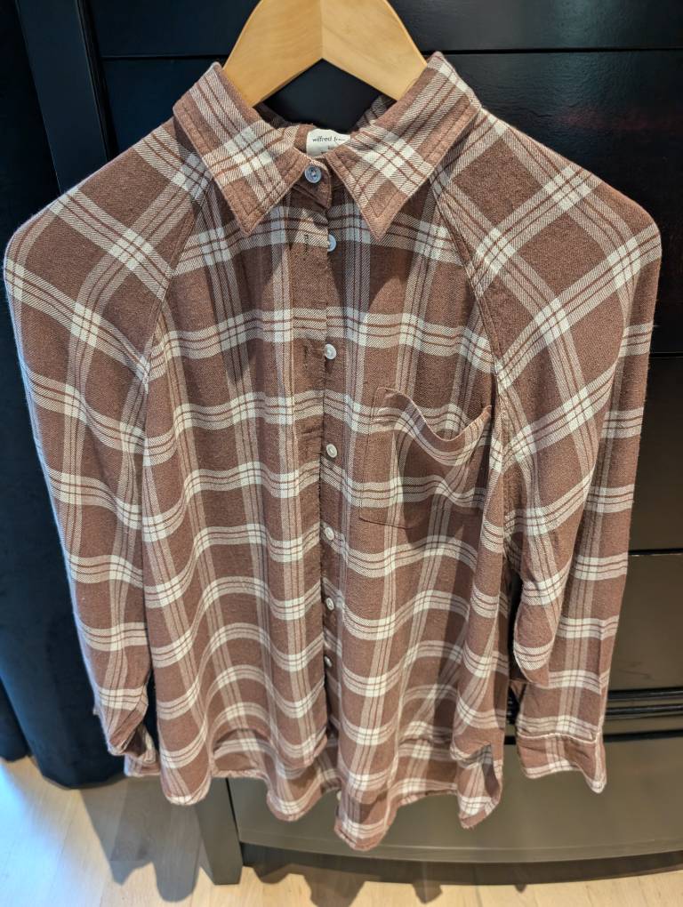 This is a lightweight brushed flannel button- down women's shirt. Super cozy and comfortable for the Fall or Winter. Lovely with a tank top, long sleeve tee , or turtle neck. Lovely plaid pattern in a light brown. In great condition. 🍁🍂