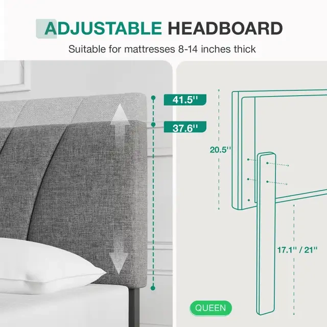 【Adjustable Headboard】The queen bed frame with headboard can be adjusted from 37.6 inches to 41.5 inches in height, suitable for mattresses from 8-14 inches. You can choose the right mattress according to your certain needs and preferences.