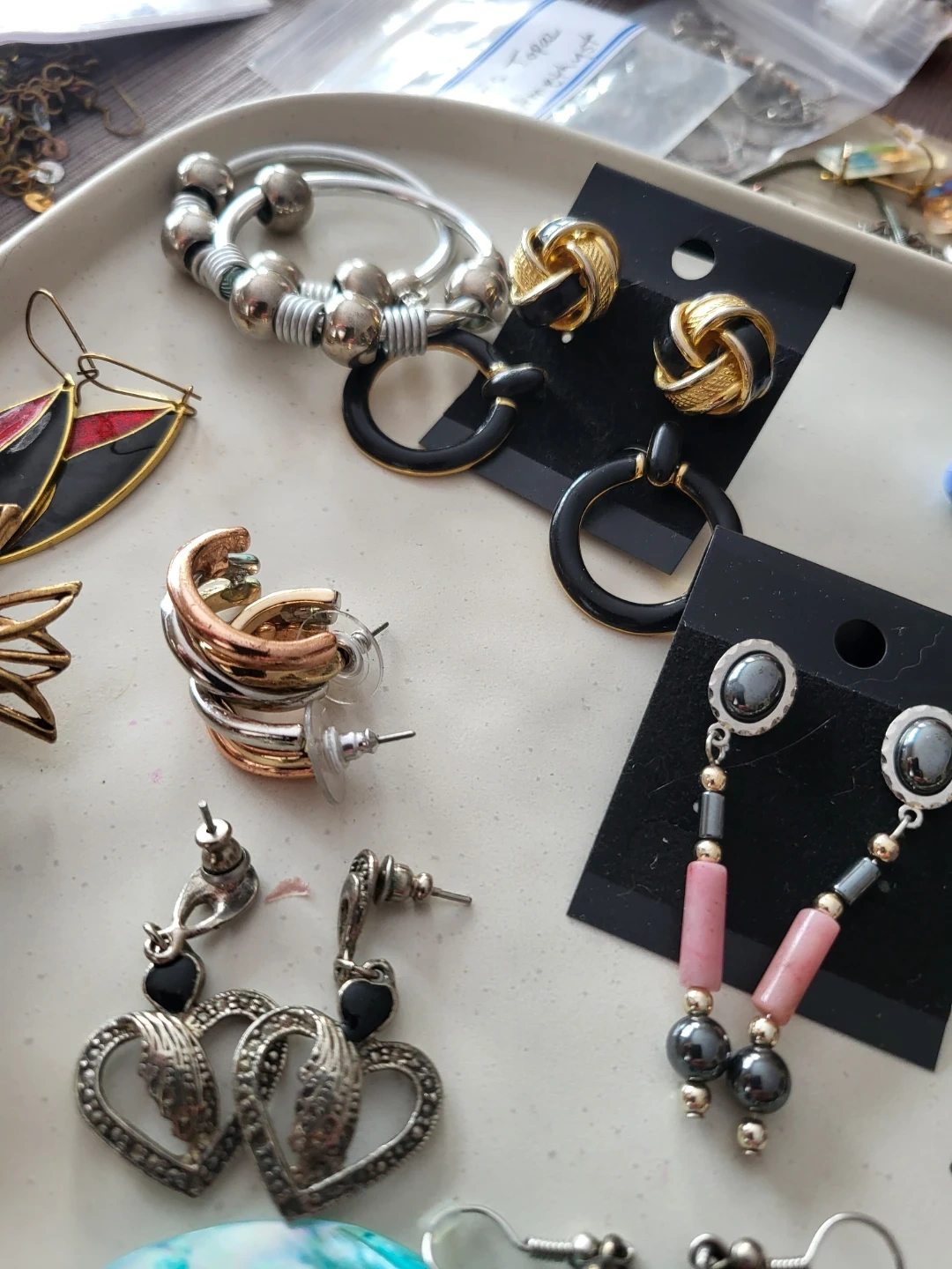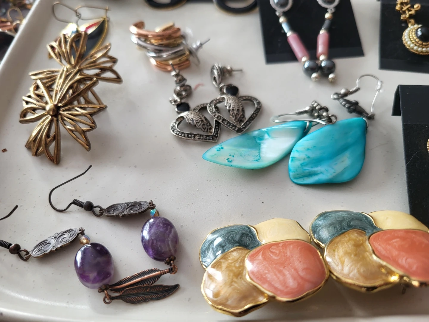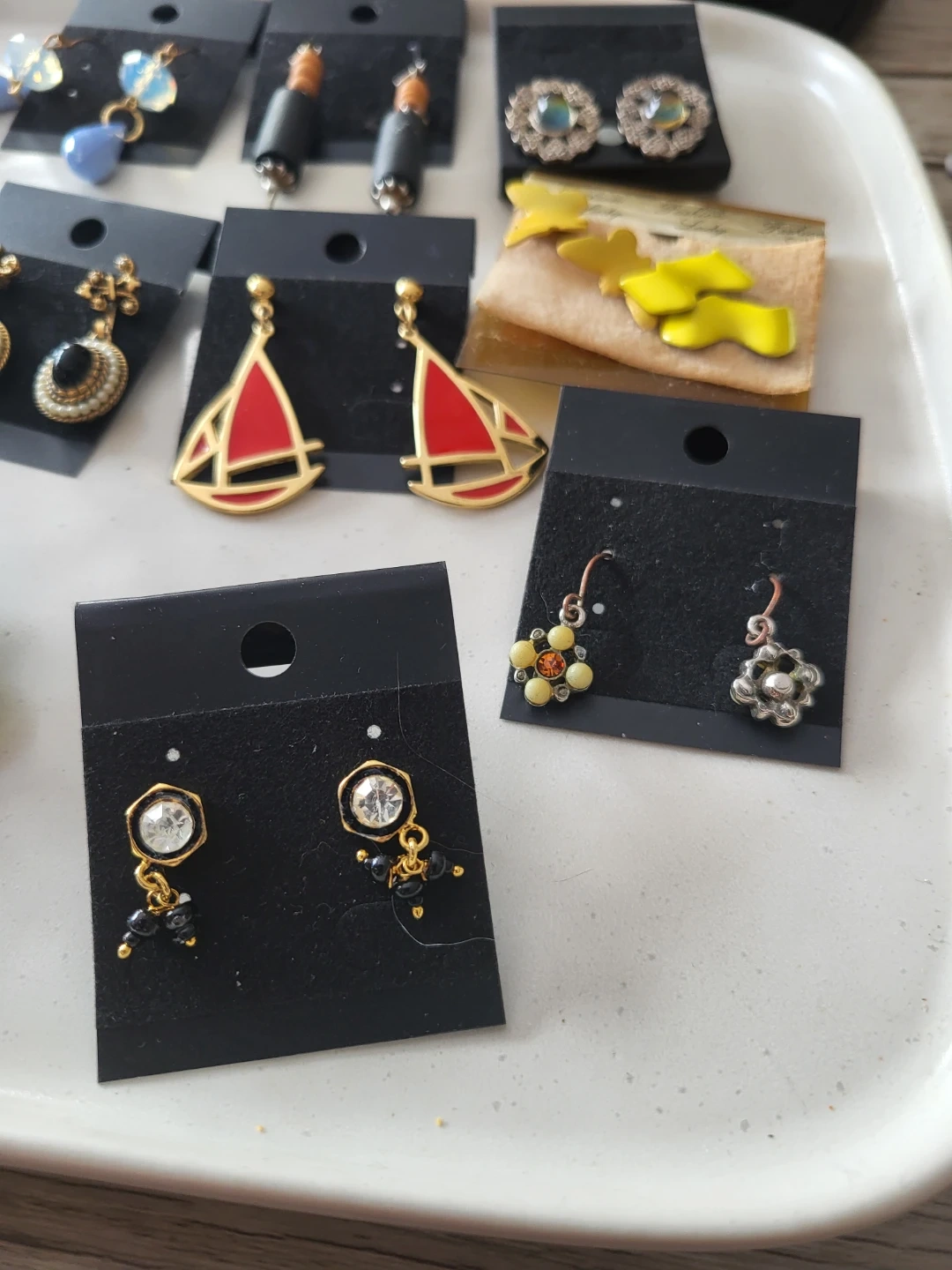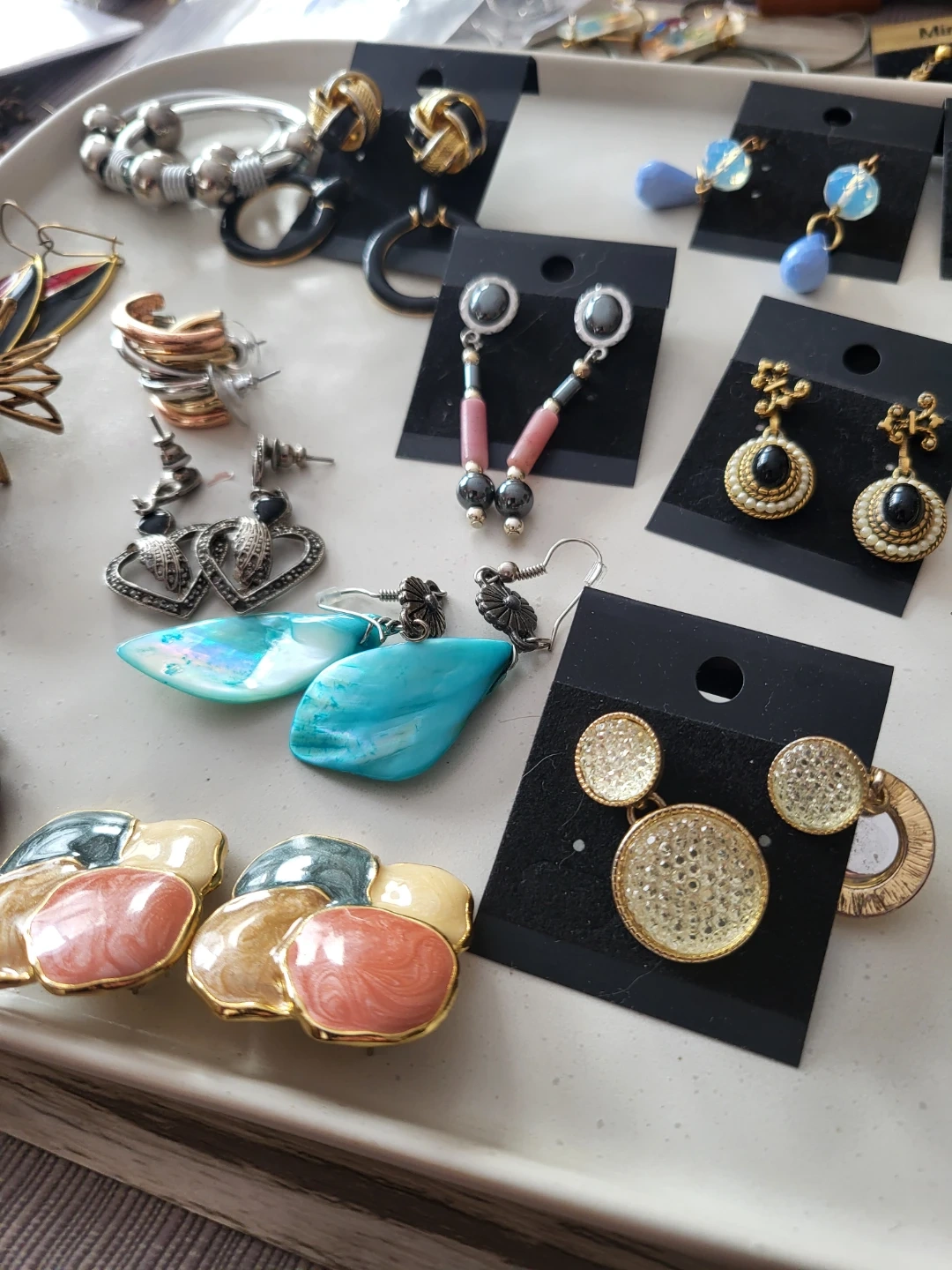 A collection of various earrings with different styles and materials. Includes dangling earrings, stud earrings, hoop earrings, and shell earrings. Most earrings come on display cards.