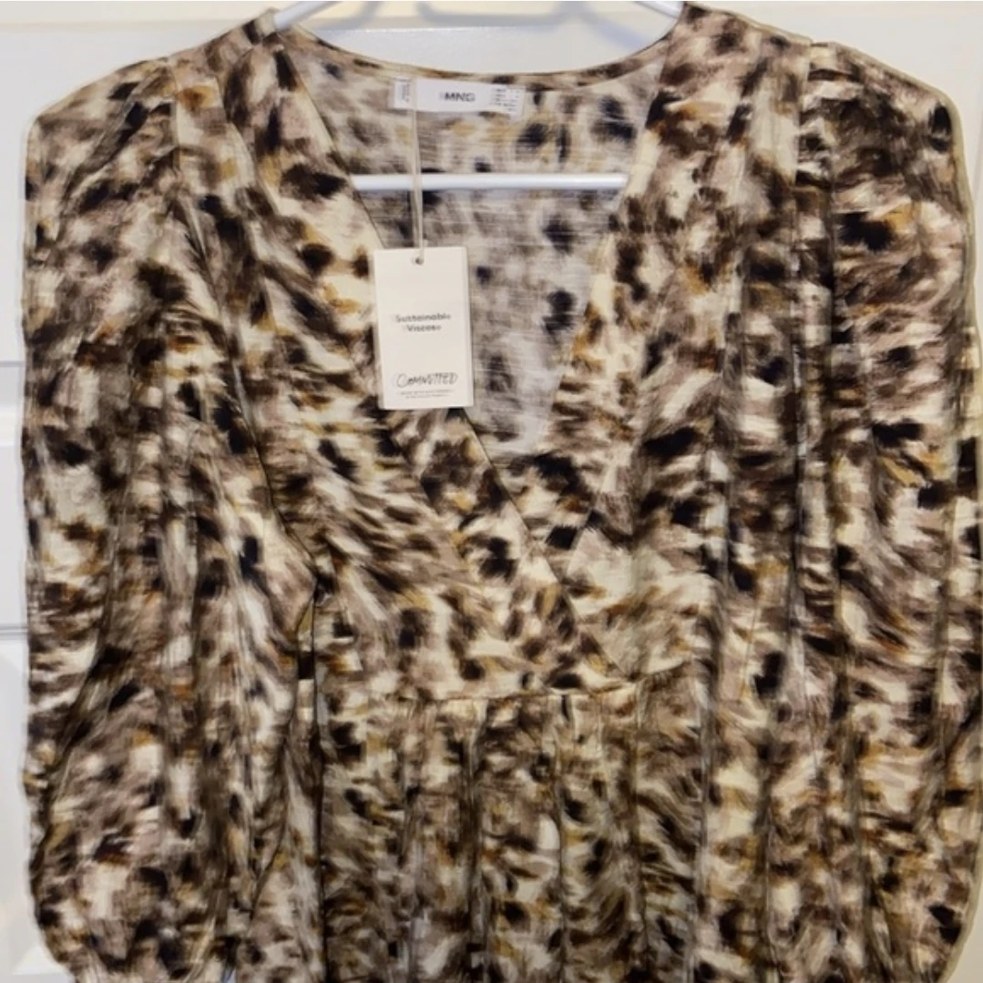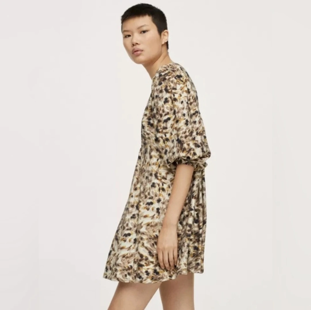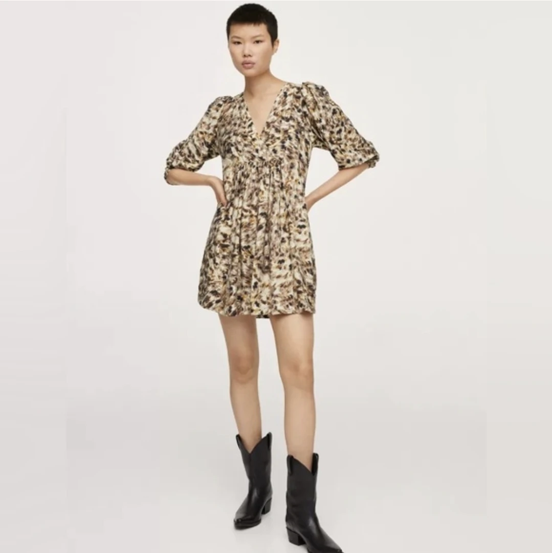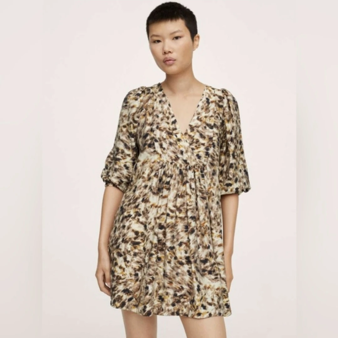 This is a Mango printed mini dress. It features a V-neck and puff sleeves. The fabric is lightweight and drapes nicely.
