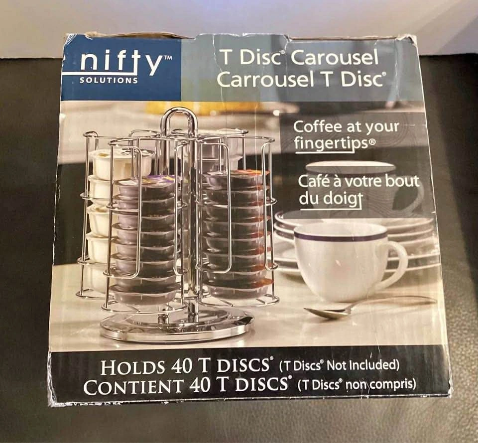 Buy & SellNifty Solutions T Disc Carousel 40 Pod HolderNifty Solutions T Disc Carousel 40 Pod Holder$10Sleek Nifty Solutions T Disc carousel. Holds 40 T Discs. Great for keeping your coffee pods neat and easy to grab. Chrome finish.WHERE TO MEETRiviera GateView MapSELLERverifiedMariaIris700 reviews0 chats·0 favorites·1 viewsSEND CHAT TO SELLERHi Maria! I’m interested in your listing.Hi Maria! I’m interested in your listing.Get the Karrot app to chatSign In to chat