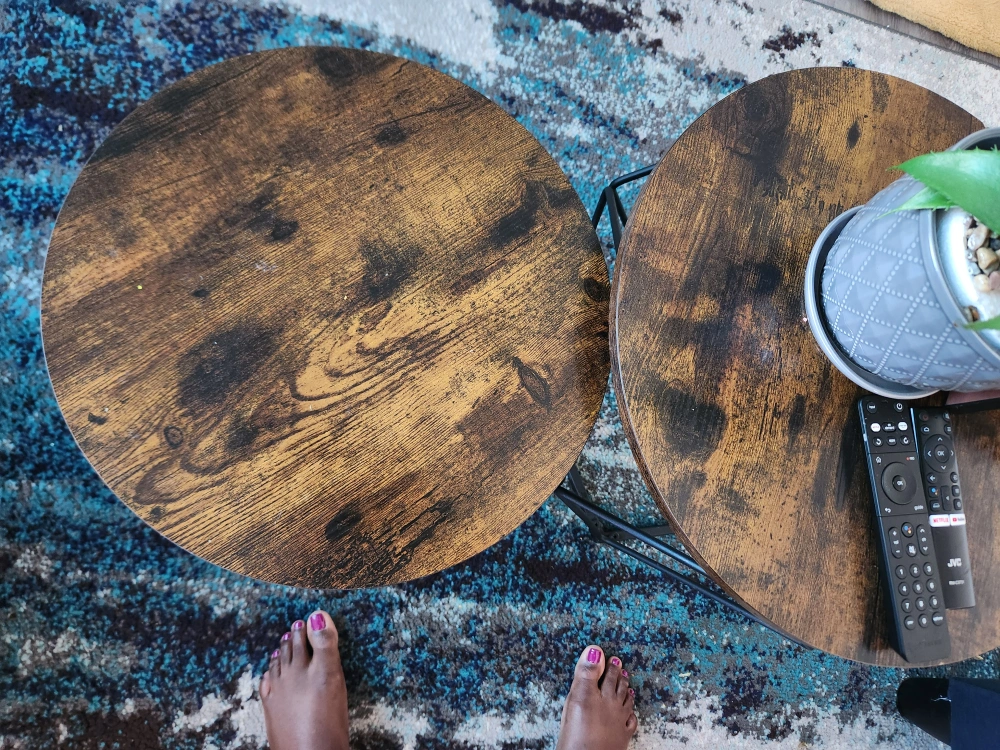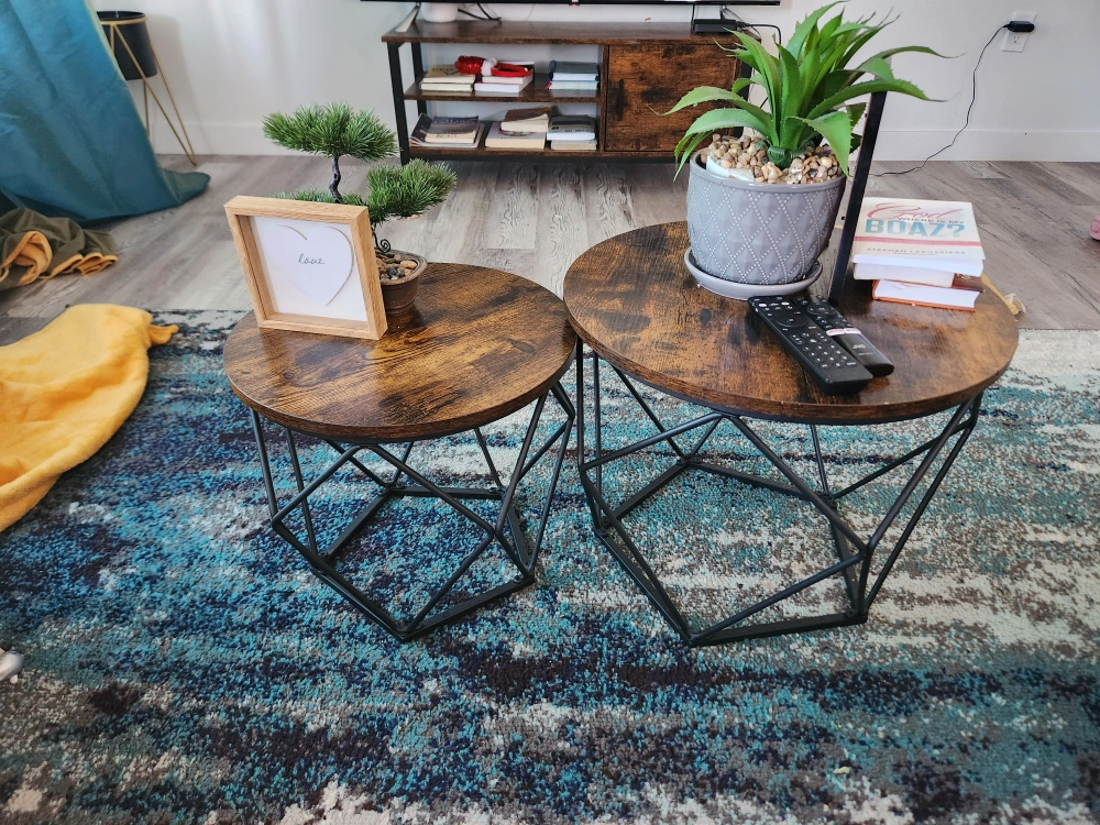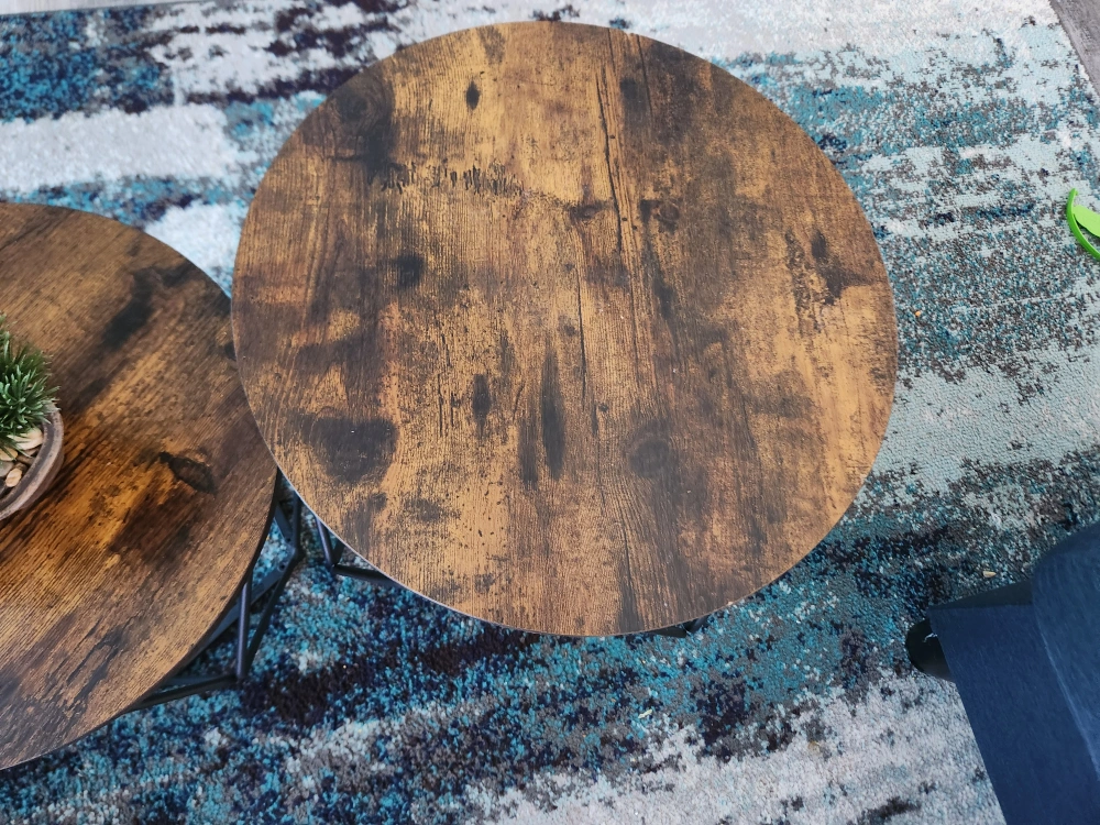 Two round tables with a geometric black metal base. The top of the tables is a wood laminate. The larger table has a diameter of approximately 20 inches and the smaller table is approximately 16 inches in diameter.