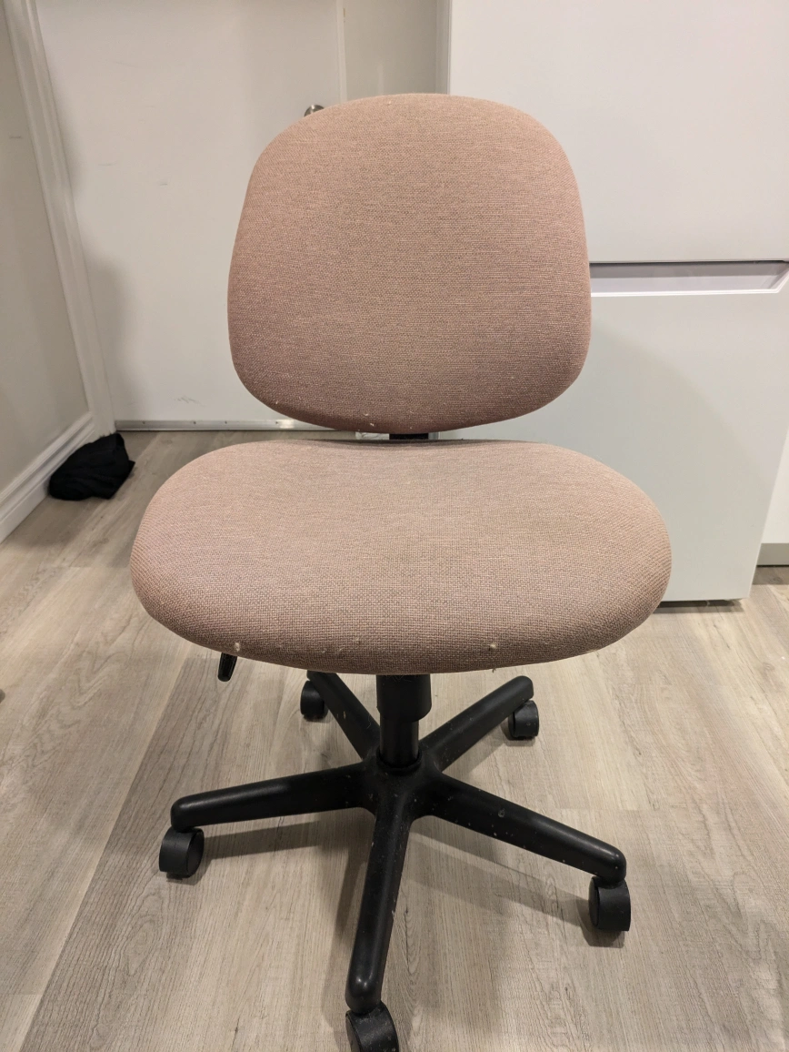 Rolling desk chair with a light pink fabric seat. I got a new chair for my desk and don't have room to keep this other one in my apartment. Pick up only. message me confirming you will get it and I'll leave it outside
