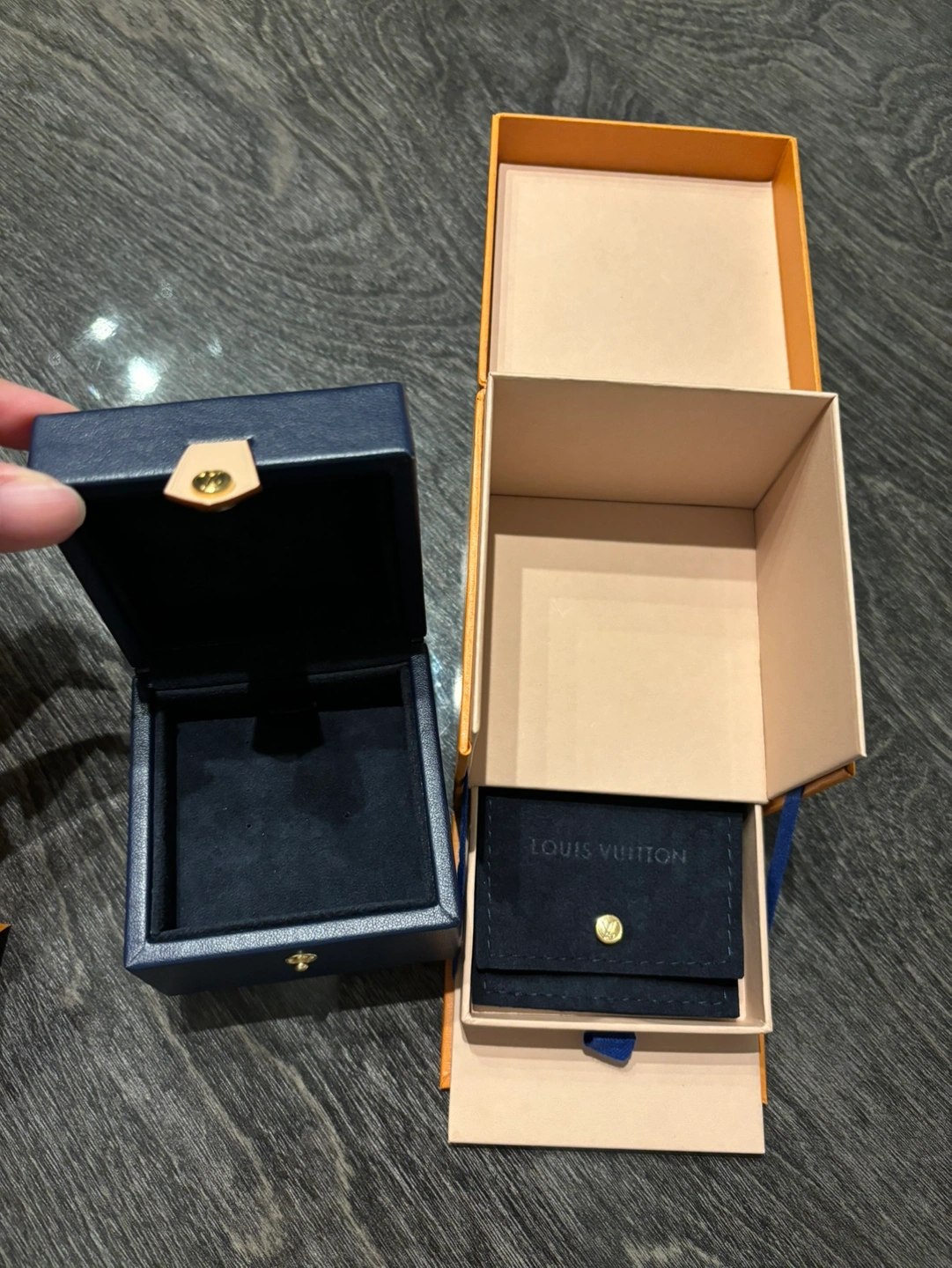 136New authentic Fine Jewelry box is in blue with leather and gold engraved button. It’s inside an orange LV box with a little drawer underneath, which has a suede travel bag with gold engraved button. It also comes with a blue ribbon, card and envelope, receipt holder, and shopping bag. In addition, it comes with the new LV Lovers perfume samples, 2ml each. Perfume is $395 plus tax for 100ml in store, the samples itself worth over $17. Feel free to contact for product details.
