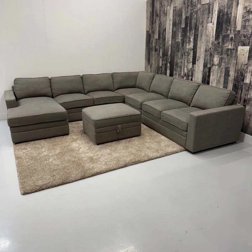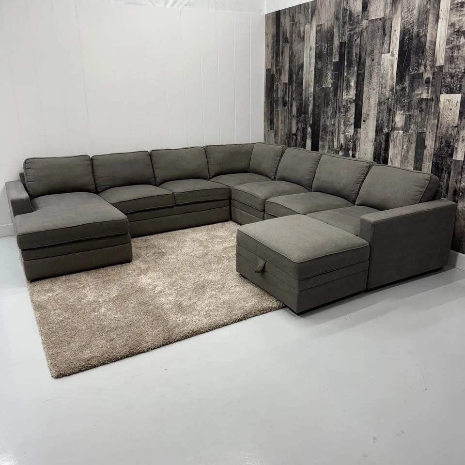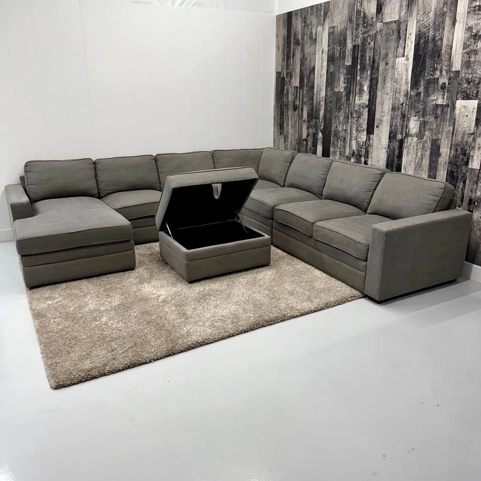 U-shape sectional with storage ottoman included. Features Thomasville build quality, removable and machine washable cushion covers, neutral grey fabric upholstery, and a deep seating design. Professionally steam cleaned using fabric shampoo and enzyme treatment. From a non-smoking home with no stains, rips, or tears — this sectional sofa / couch is ready for its next space.