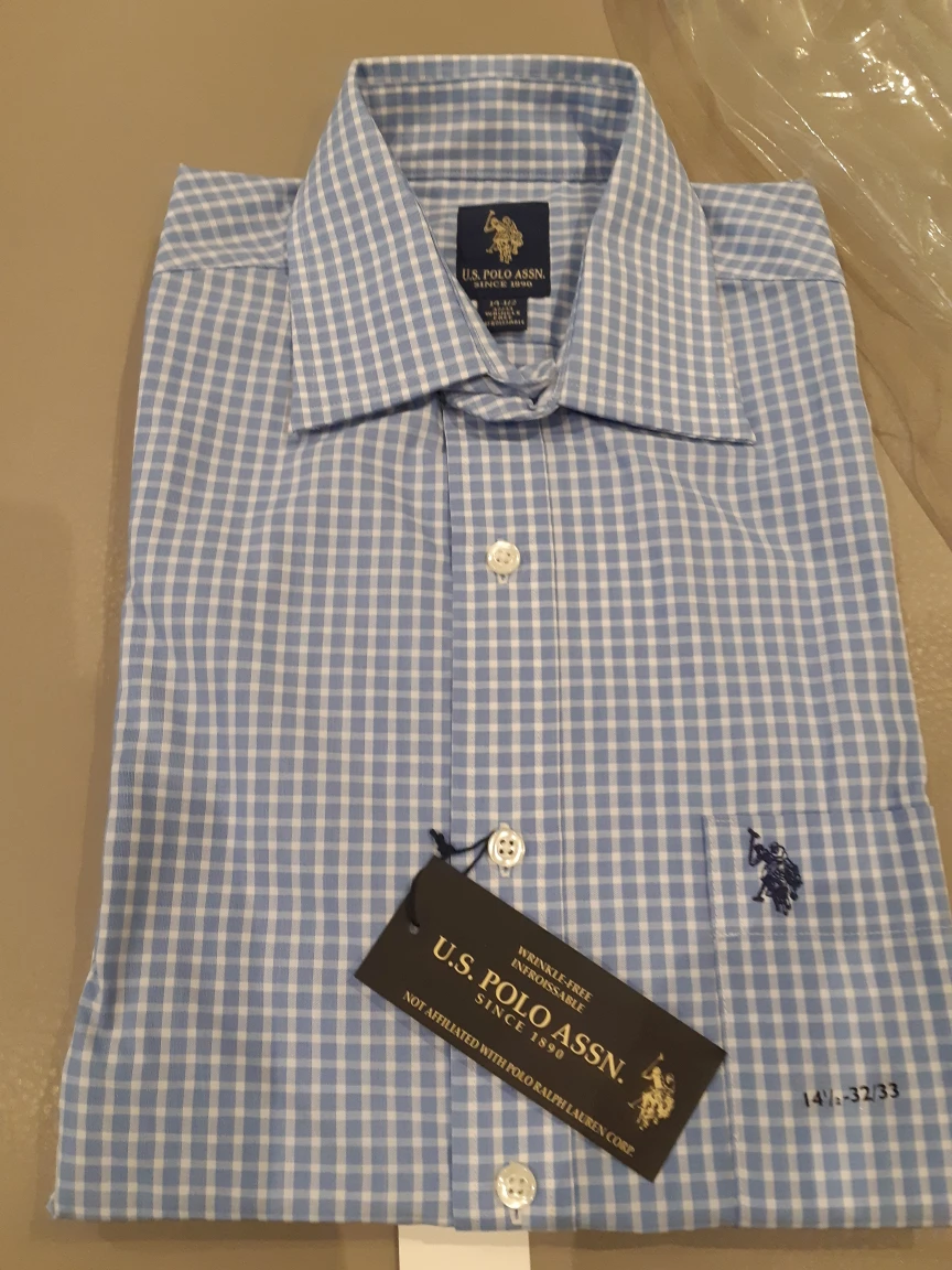 Excellent quality wrinkle free infroissable US.POLO ASSN blue whit check button front long sleeves small regular fit 14 1/2 from pets/smoke free home serious buyers only swipe for more pics