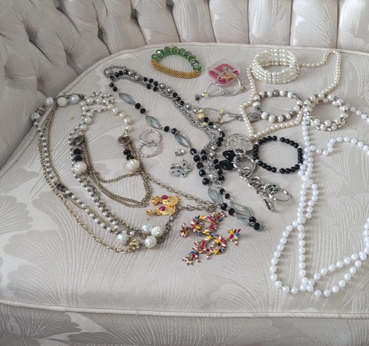 A collection of costume jewelry pieces, including necklaces, bracelets, and earrings. Features faux pearls, beads, and metallic accents. Assorted styles and designs.